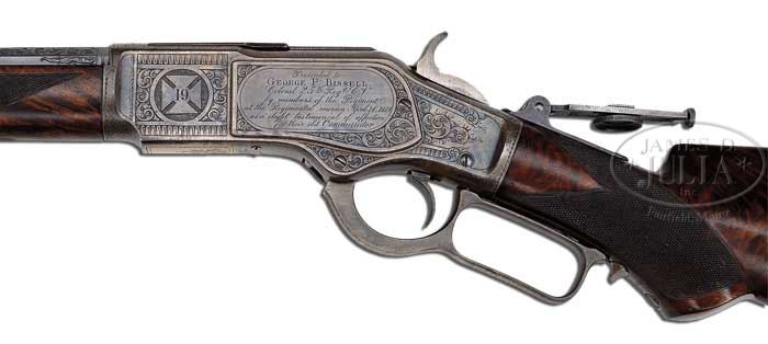 RARE PRESENTATION FACTORY ENGRAVED WINCHESTER MODEL 1873 DELUXE LEVER ACTION RIFLE. SN 148025. Cal. 44 WCF (44-40). Beautiful John Ulrich engraved ’73 with 24-1/4″ oct bbl, full magazine, windgage globe front sight, semi-buckhorn rear sight and a thin base vernier tang sight with 3″ staff. Mounted with extraordinary 3-4X American walnut with H-style checkered forearm and serpentine pistol grip stock with black fleur-de-lis insert and full checkered hard rubber buttplate. Left side of lower tang, under the wood, is marked with assembly number “5359”, “XXX” and “S”. Matching assembly number is found in top tang channel of buttstock and hand scratced inside toe of buttplate. Receiver is spectacularly engraved by John Ulrich and signed on lower tang. Left side plate has the large oval panel inscribed in period script and block letters “Presented to / GEORGE P. BISSELL / Colonel 25th Reg.t C.V. / by members of the Regiment / as a slight testimonial of affection / for their old Commander”. Left front flat is engraved with the vignette of the 19th Corps badge of the Civil War. Right sideplate is wonderfully engraved with the modified vignette of the No. 4 style pattern depicting a hunter shooting from behind a tree with a wounded bull elk in foreground. Right front flat is engraved with a standing cow elk. All the engraving is surrounded by beautiful foliate arabesque patterns with fine punch dot background and scalloped borders. Engraving extends over top & bottom of receiver and dust cover with matching engraving about 2-1/2″ over chamber area of bbl and 1-3/4″ around muzzle. Chamber end of bbl and muzzle end have silver band inlays. Col. George Bissell was the commander of the 25th Regiment, Connecticut Volunteers, a 9-month regiment recruited in the Fall of 1862 and mustered into service on Nov. 11, 1862. They sailed from Hartford to Long Island, NY to join the “Banks Expedition” with 811 men. They embarked on Nov. 29, 1862 and arrived at the mouth of the Mississippi River then sailed up the Mississippi to New Orleans arriving on December 14th. They were brigaded under Gen. Paine along with four other regiments where they advanced on Fort Hudson arriving on March 10, 1863 and began their offense on Fort Hudson with Col. Bissell in charge of his own regiment, two detachments of cavalry and a regular Army battery. After the capture of Fort Hudson the regiment traveled to Baton Rouge engaging in several skirmishes and sailed on up the Atchafalaya Bayou, landing at Irish Bend where on April 14, 1863 they engaged in their first real battle, losing 95 killed & wounded. They continued this campaign, driving the Confederate troops through the entire valley of the Teche fighting four separate engagements and marching 300 miles in 20 days. During May & part of June they returned in the Siege of Fort Hudson, being almost constantly under fire in the trenches and engaging in several assaults. They led the advance on May 23 which resulted in the capture of Fort Hudson. After the surrender of Fort Hudson the 25th Connecticut Infantry Regiment returned to camp at Donaldsonville where they remained until their expiration of service and were mustered out at Hartford on Aug. 26, 1863. The regiment volunteered to serve longer but since the area was secure their request was denied and they were mustered out. PROVENANCE: Wes Adams Estate Collection. CONDITION: Very fine. Bbl & magazine tube retain 97-98% strong orig blue with only light sharp edge wear; receiver retains about all of its orig case colors, strong in sheltered areas, fading elsewhere. Wood is sound with light, scattered fine nicks & scratches and retains about all of its strong orig oil finish. Buttplate has a large chip out of right lower side. Mechanics are crisp, brilliant shiny bore. 4-44566 JR70 (30,000-50,000)