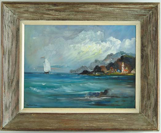 THOMAS CASILEAR COLE (American, 1888-1976) SAILING ALONG COAST. Colorful oil on canvas mounted on board shows white sailed ship coming along coast with high mountains and colorful village with lighthouse. Signed lower left “Casilear Cole”. Housed in a weathered wood frame with white liner. SIZE: 15” x 20”. CONDITION: Very good. 9-96790 (400-600)