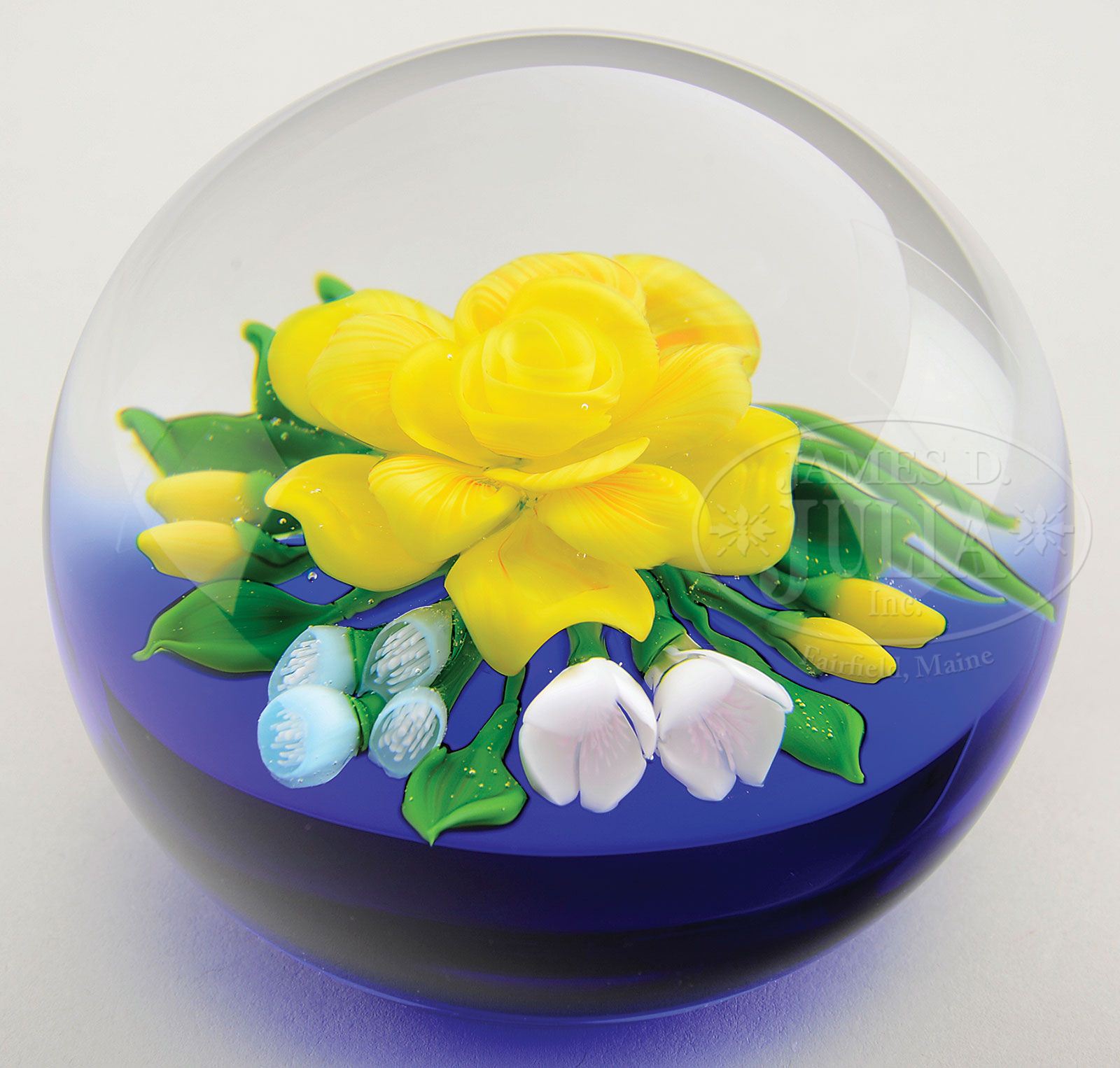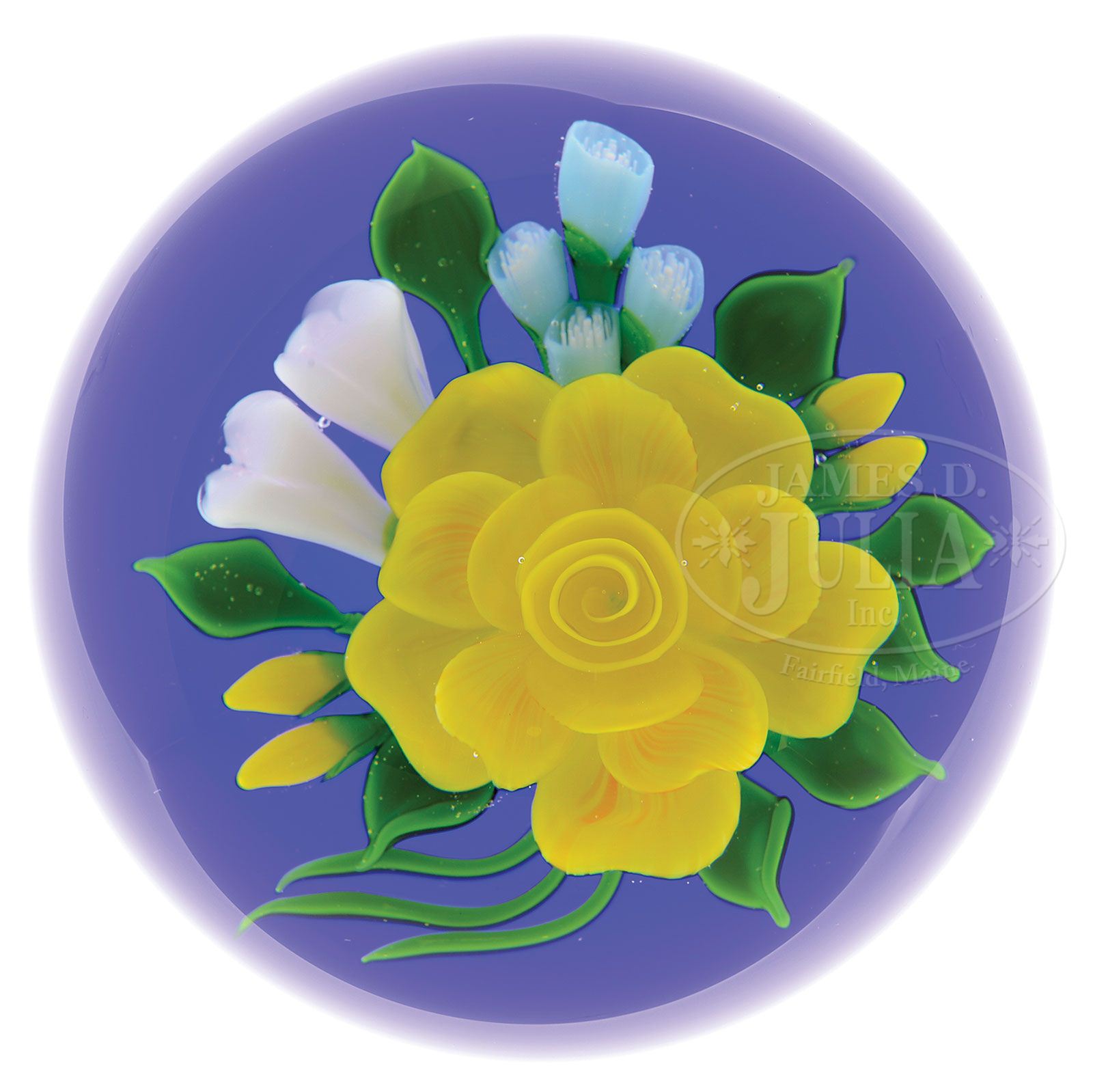 VICTOR TRABUCCO ROSE BOUQUET PAPERWEIGHT. Large central yellow rose is surrounded by blue and white flower blossoms, yellow buds and green leaves. Bouquet rests on a cobalt blue ground and is signed in script “Trabucco 1987” it also has a “VT” signature cane underneath one leaf. SIZE: 3″ dia x 2-3/4″ t. CONDITION: Very good to excellent. 5-65433 (300-500)