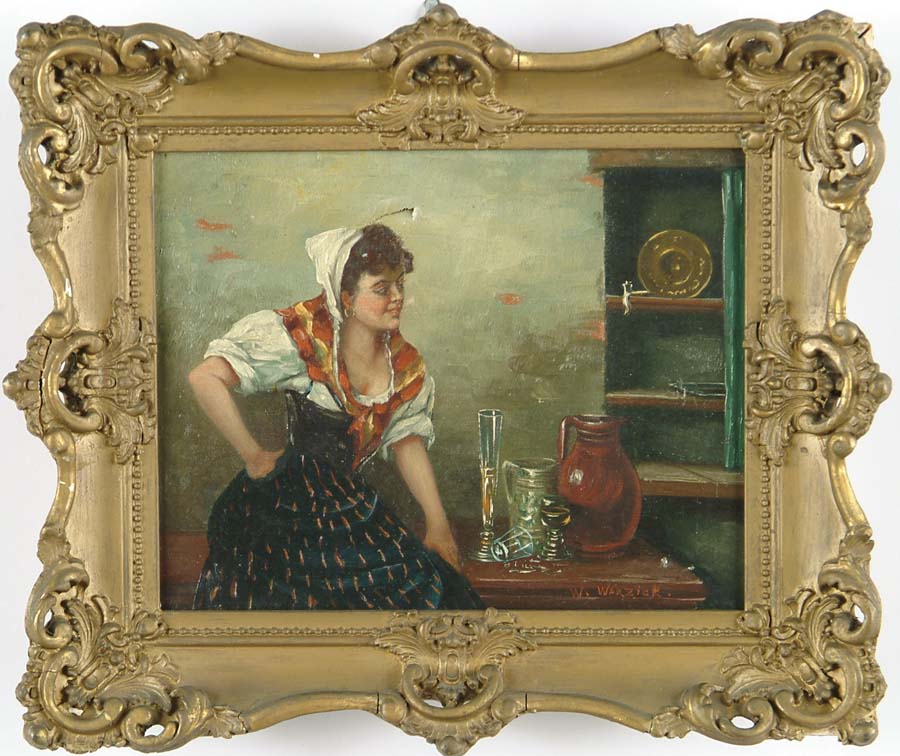 W. WARZICK (European, 19th/20th C) THE BARMAID. Oil on canvas interior scene shows young woman in Gypsy type dress with white scarf on head next to table with glasses, jug and stein. Signed lower right “W. Warzick”. Housed in a fancy gesso decorated gilt frame (some repair). SIGHT SIZE: 7-1/2” x 9-1/2”. CONDITION: 1” tear above head, otherwise good. 9-97211 (100-200)