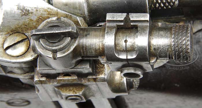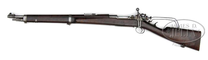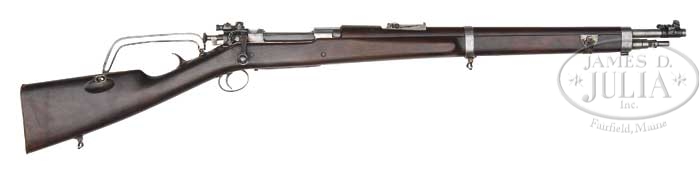 *EXTRAORDINARY AND RARE PROTOTYPE/EXPERIMENTAL SEMI-AUTO MILITARY RIFLE BASED LOOSELY ON THE 1903 SPRINGFIELD. SN NONE. Cal. Presumed to be 30-06. Extremely unusual prototype rifle with all metal in-the-white. Bbl appears to be from a 1903 Springfield with Ordnance bomb and the date “2-06”. The front nomenclature is covered by the front sight collar or was machined away to accommodate the special front sight. Bbl is 24″, rnd, with tall barleycorn front sight and an unusual 1900 yard ladder rear sight with stepped base marked to 600 yards and the ladder 700-1900 yards. Sight base is about 2-7/8″ long x 7/8″ wide and mounted with two common screws. The slide on the staff is about 1-3/8″ long x 3/8″ wide x 5/16″ thick, serrated on left end with a spring loaded push button on right end which releases the slide to change the elevation and then locks into notches on inside of right arm of the staff. Receiver resembles a heavy Model 1903 that is about 6-7/8″ long with a solid rear bridge that has a radiused lightning groove over the top and left side of receiver has a lightning groove. The cutoff is built into a housing on left side of the rear bridge with a long oval checkered pad which mounts forward and is retained with a screw from the top. Below & behind the cutoff housing is the special mount for the special receiver sight. Receiver is without a gas relief port. Bolt appears to have a Springfield body with square shoulder handle with an unusual shroud which is connected to two steel rods which pass through recesses in the receiver and connect to the gas system inside the forearm. Striker has a knurled rim with a sear extension off the bottom which fits into a groove in the receiver to contact the trigger. The special rear sight is similar to a Lyman receiver sight with long, split slide which has a swinging arm attached to the top with detent notches which locks it into place either out of the way parallel with the axis of the bolt or perpendicular, 90 degrees from the bolt. The slide is adjustable for elevation by means of a checkered spring loaded button on rear edge and adjustable windage by a knurled micrometer style knob on the extended bbl of the cross slide. The sight aperture itself is equally unusual in that in one position it is a peep sight and when rotated 180 degrees becomes a v-notch open sight. Front sight is also most unusual in that it is a solid machined sleeve with integral barleycorn front blade and a yoke off the left side which contains a spring loaded swinging arm that folds out of the way to the right allowing use of the normal rear sight. However when extended out to the left and locked into its detent, exposes a separate barleycorn sight for use with the extended receiver sight. All of the foregoing is simply part of this unusual rifle which has an apparatus attached to the top of the wrist of the stock which is a dbl steel wire frame which attaches to the top tang and extends to the rear into a steel fixture in the comb of the stock which prevents the shooter from extending his head & face into the path of the bolt in semi-auto mode. The rear part of the top tang has a metal thumb rest which prevents the shooter’s thumb from rising into the path of the rearward traveling bolt. It is readily apparent that rifle is gas operated as it displays a rudimentary gas cylinder at the end of the forearm with what appears to be gas ports through a hole in bottom of bayonet lug and a small steel insert just above the middle band which has several small vent holes. The bottom forward portion of the forestock has an inlaid metal fixture with a large, flush mounted screw that is safety wired in place and is, what appears to be, a rudimentary adjustable gas system. The floorplate & trigger guard are custom built with a metal floorplate that is screwed in place onto the trigger plate which has a welded oval trigger guard. The stock is extra wide up to the rear band apparently to clear the operating rods which make the bolt function. The middle stock band is flat machine steel with beveled edges and a permanently mounted sling loop with a corresponding sling loop in the buttstock. Buttplate is slightly convex with a mild convex shape, made of smooth steel mounted by means of two screws. No attempt was made to disassemble this rifle due to the complexity of the mechanisms and lack of knowledge of how it is to be disassembled without damaging any of the parts. Accompanied by two copies of the Springfield Research Newsletter U.S. Martial Arms Collector of April 2006 and August 2007. The 2007 issue shows photographs of this same rifle but offers no additional help in its function. The 2006 issue shows photographs and a writeup regarding another experimental semi-auto rifle. Altogether an exciting and unusual rifle that requires substantial additional research and examination to determine the actual function of the various mechanisms and its place in the development of follow-on semi-auto rifles. CONDITION: Appears to be fine & functional although no testing or detailed examination was possible. Overall retains about all of its orig bright metal finish with a few scattered spots of discoloration. Wood is sound with a few minor handling & storage nicks & scratches and retains a dark hand worn patina. Mechanics appear to be fine, strong bore, dark in the grooves. 4-40038 JR243 (50,000-100,000)