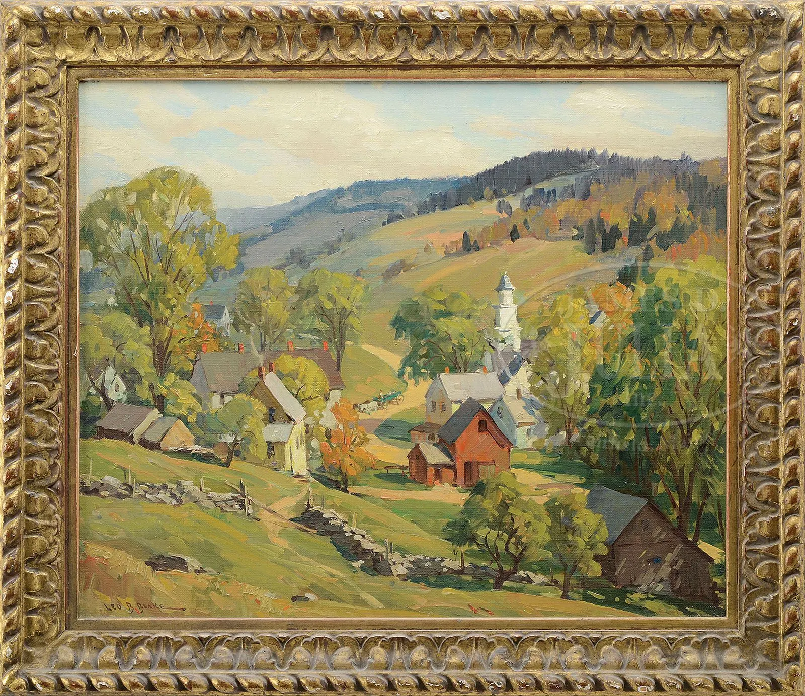 LEO B. BLAKE (American, 1887-1976) AUTUMN BIRDSEYE VIEW OF A VERMONT VILLAGE/HORSE DRAWN WAGON & RIDER IN MID-GROUND. Oil on canvas Housed in a gold carved Baroque style frame with some wear Signed lower left “Leo B. Blake” Artist information and 1948 Vermont calendar with examples of the artist’s work affixed to verso SIZE: 20-1/2″ x 24-1/2″. Overall: 26″ x 28-1/2″ PROVENANCE: The John F. Gale Collection, Cambridge, MA CONDITION: Very good 9-27319 (1,200-1,800)