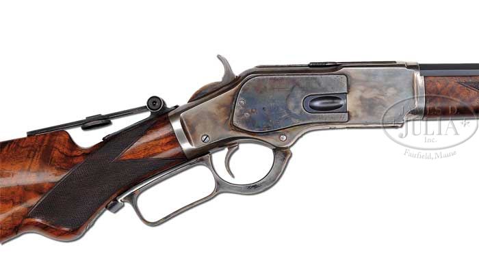 RARE SPECIAL ORDER DELUXE WINCHESTER MODEL 1873 LEVER ACTION RIFLE. SN 478331. Cal. 32 WCF (32-20). Beautiful deluxe ’73 with special order 26″ oct bbl, full magazine, German silver Rocky Mountain front sight, semi-buckhorn rear sight and vernier tang sight with 4″ staff. Receiver & forend cap are color case hardened. Mounted with very highly figured, center crotch, flame grain American walnut with H-style checkered forearm and serpentine grip buttstock with black insert and deep Swiss cheekpiece and nickeled brass Swiss buttplate. Left side of lower tang is marked with assembly number “1431”, “XXX” and “SRB”. Top tang channel of buttstock and inside toe of buttplate have matching assembly numbers. Accompanied by a Cody Firearms Museum letter identifying this rifle in caliber 32 with 26″ oct bbl, plain trigger, fancy checkered stock with pistol grip and Swiss cheekpiece and case hardened. Received in warehouse June 20, 1894 and shipped same day to Order #15215. This rifle is pictured on p. 141 of Volume I of Winchester New Model 1873, Gordon. While deluxe ’73s in caliber 32 are not uncommon, they are rarely found with color case hardened receivers and with the addition of the Swiss cheekpiece, Swiss buttplate and vernier tang sight makes this a very rare rifle. It is likely that this rifle was purchased for 200 yard off hand competition shooting. The low recoil caliber in this heavy rifle would have been ideal and that, combined with the other features, makes this a very strong likelihood. PROVENANCE: Wes Adams Estate Collection. CONDITION: Very fine, all matching. Bbl & magazine tube retain 97-98% strong orig blue with faint sharp edge wear; receiver retains 80-85% orig case colors, moderately to heavily faded, strong on sideplates, turned silver over bottom & top front edges; hammer retains strong bright case colors and the lever bright case colors on sides, fading on outer faces; dust cover is a plummy/blue patina. Wood is sound with a few light handling & storage nicks & scratches with buttstock retaining about all of its bright, orig piano varnish finish and the forearm about 70% strong orig finish, showing wear on bottom rear with moderate wear on checkiering. Mechanics are crisp, brilliant shiny bore. 4-44564 JR69 (30,000-40,000)