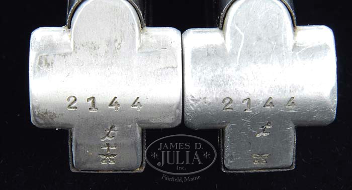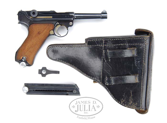 *BEAUTIFUL MAUSER 1937 S/42 FIRST VARIATION LUGER WITH RIG. SN 2744t.. Cal. 9 mm. Wonderful Luger & rig with 4″ bbl, “S/42” on front toggle link, “1937” over chamber & eagle “63” proofs on right side of receiver. This is the early variation with straw colored small parts with two orig matching numbered magazines & an eagle “63” proofed takedown tool. Accompanied by a black leather holster with a large script trademark that appears to be “LR”. It has two “WaA 145” Waffenampts & “1937” date stamped on the back side. Holster has a border on the flap and at the top of the opening. A 1937 S/42 with straw colored parts is hard to find in this condition & extremely difficult to obtain with two matching magazines & correct orig holster. PROVENANCE: Doug Smith Collection. CONDITION: Extremely fine plus, all matching including grips & two magazines. Overall retains about 98% strong orig factory blue & about 92-94% strong orig factory straw colors. Grips are crisp with beautiful wood grain showing through & two or three chipped diamonds, with no hand grease, retaining most of their orig factory color. Magazines & tool are also extremely fine. Mechanics are crisp, brilliant shiny bore. Holster is very fine to extremely fine with light wear & scuffs and minor flexing & flaking on the strap. 4-36147 JR207 & BS (7,000-10,000)