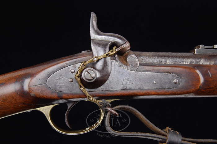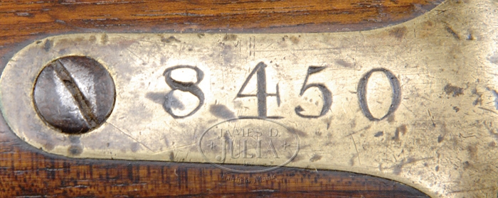BLOCKADE RUN LONDON ARMORY COMPANY ENFIELD RIFLED MUSKET. SN 8450. Cal. 577. This is a standard Model 1853 Enfield rifled musket; the most popular weapon of the Confederate infantryman during the Civil War. Lock is marked “1861 / L. A. Co.” forward of hammer, and rear of hammer with a crown and “VR”. “VR” commemorated the current British monarch, Queen Victoria (Victoria Regina). Stock has about a 7/8″ cartouche which reads “London Armory Company / 1861”. SN is cut into buttplate tang. London Armory muskets are not found with a “JS / anchor” marked as are most other serial numbered Blockade Run Enfields. Accompanied by leather sling and bayonet with engraved numbers on socket, engraved vertically in 2 lines “23 / 156”. Initials “AP” are found carved on left side of buttstock, probably by the Confederate who carried this gun. Mr. Michel’s Notes State: “Patten 53 Enfield rifled musket manufactured by London Armory Co., a principal supplier of arms to the Confederacy. Lockplate marked, forward of the hammer, “1861 / L. A. Co.” and at the tail, crown over “VR”. The tang of the buttplate is engraved with the inventory number “8450” used to keep track of arms shipments to the Confederacy.” PROVENANCE: Ben Michel collection. CONDITION: Bbl is brown with areas of pitting. Bbl flat at tang has been ground, continuing onto tang. Bbl exhibits discernible rifling, though pitted. Lock is gray with clear markings. Brass mounts are smooth with scattered dings and scrapes. Stock exhibits dings, scratches, and several small cracks. Ramrod is dark and pitted, matching condition of bbl. Bayonet socket exhibits traces of finish and blade is cleaned. 4-31310 JS141 (4,000-6,000)