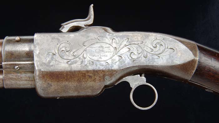 EXTREMELY RARE SMITH-JENNINGS 2ND MODEL REPEATING RIFLE. Cal. 54. SN 6S. Beautiful historic repeating rifle, the forerunner to several rifles & pistols preceding the Winchester repeating rifle, as developed by Horace Smith & B. Tyler Henry, who were both instrumental in the development of this rifle. It is believed that less than 400 of these 2nd models were ever produced and few survived and almost never with any orig condition. This rifle & its sisters utilized the “rocket ball” self contained cartridge which had its propellant in the base of the hollow bullet and was ignited by means of a pellet primer fed automatically into the proper position under the long hammer nose. The Smith-Jennings rifles were the successor to the Jennings rifle, which was relatively unsuccessful, as was its predecessor, the Hunt repeating rifle. With the lack of success of the first two rifles, the talents of Henry, Smith & Daniel Wesson were combined to produce this rifle and while it was not overly successful, the importance to the development of future repeating firearms is immeasurable, having drawn these three huge talents together to collaborate on improving the Jennings rifle. As it is well known, Henry later developed the cartridges & rifles for the famous Model 1860 Henry rifle and Smith & Wesson needs no explanation. This rifle has 26” heavy rnd bbl with full length front loading magazine tube underneath. It has a tiny German silver front sight with Kentucky rifle style fixed rear sight. The iron receiver is flat-sided with a pronounced bulge in bottom and has the covered pill primer reservoir on the top. Right side of frame, just forward of the hammer, has a small rectangular door which, when opened, exposes the breech mechanism, apparently for single shot loading. It has a ring trigger without triggerguard which, serves to both open the breech, recharge the chamber from the magazine and then release the hammer. Both sides of receiver and across the top are lightly engraved with foliate arabesque patterns. Left side has an oval vignette marked “PATENT 1849 / C.P. DIXON AGENT / NEW YORK”. The magazine tube cover is missing. Mounted with uncheckered straight grain American walnut with a steel semi-crescent buttplate with engraved tang & toe. Right side of stock has a 2-3/4” x 1-5/16” oval German silver inlay that is also lightly engraved with a large stylized “S” and light foliate patterns. CONDITION: Very fine. Bbl & magazine tube retain generous amounts of thin orig brown finish with dark brown finish on the ribs between bbl & magazine tube. There are a few spots of moderate pitting. Receiver retains traces of silvered case colors, being mostly a brown patina. Stock is sound & retains 85-90% strong orig varnish. Mechanics are fine, strong dark bore with moderate pitting. 4-30233 JR74 (17,500-22,500)