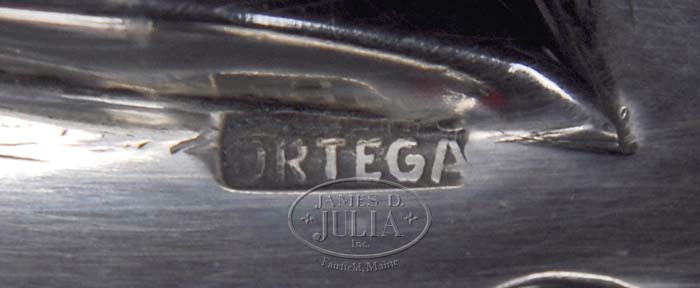 FINE REPOUSSE SILVER CHARGER, A. ORTEGA. Second quarter 20th century. This exceptional Mexican silver charger, manufactured and signed by Alfredo Ortega, features a border of interlocking C-scrolls alternating with fruit sprays within a scalloped ribbed border, centering a large repousse classical handled urn filled with fruit and berries within a circle of scrolling brightwork. The “Ortega” hallmark is below the urn. On the back of the charger are four hallmarks “925”, “ORTEGA”, “MEXICO”, and a displayed eagle above the numerals “12487”. Total weighable 59 troy ounces. SIZE: 17-1/2″ dia. CONDITION: Overall in very nice condition, with minor and minimal surface scratches on burnished areas. Hallmarks all distinct. 9-94511 (1,500-2,500)