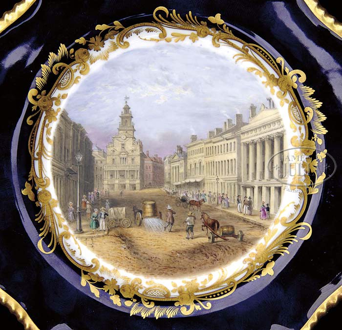 GROUP OF ENGLISH PORCELAIN SCENIC TABLE WARES. 19th century. The first example, a cabinet plate with a central hand painted scene titled “State Street Boston” within a floral gilt border. Together with two cups and a matching saucer, each decorated with reserves of English landscapes within cobalt and gilt decorated borders alternating with fruit decorated reserves. SIZE: 9″ dia. plate; 2-1/4″ h cups; 5-1/2″ dia. saucer. PROVENANCE: From the private collection of Dorothy-Lee Jones. CONDITION: Very good overall. Painted scenes remain vibrant. 9-23325 (500-700)
