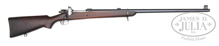 *OUTSTANDING SPRINGFIELD T-SERIES HEAVY BARREL TARGET RIFLE. SN 1314146. Cal. 30-06. Rare Springfield rifle with extra-heavy tapered 30″ bbl with BAR front sight base mounted with a Winchester style globe front sight. Top of bbl & front receiver ring are drilled & tapped and contain target scope bases. There are two extra plugged scope base holes on the bbl behind the front block. Bottom of bbl is stamped with the star gauge number “1187”. Receiver ring has the standard Model 1903 markings and the rear bridge is mounted with a Lyman 48S receiver sight with target knobs. Bolt body, extractor & handle are polished bright. Bolt shroud, safety & striker are blued. Striker is headless type and the safety is reversed. Mounted in its orig walnut half stock, uncheckered, without grasping grooves with pistol grip and an M1922 style checkered steel buttplate. Bottom of butt has a standard M1903 sling loop. Bbl is secured in the stock with a sgl band around forestock. Band is made from the rear band of a Model 1917 rifle. Trigger guard & floorplate are standard milled 1903 equipment. This rifle is pictured on p. 129 of The Springfield 1903 Rifles, Brophy, as the bottom illustration and as identifiable by stock characteristics. Lt. Col. Brophy states that the headless cocking piece, or striker, and the standard knurled cocking piece were installed with no consistency. He states that he has “two consecutively serial numbered Style T rifles. One has a twenty-eight-inch barrel and the other has a thirty-inch-barrel. One has a headless cocking piece and reverse safety. The other has the standard type parts.” Accompanied by a Springfield Research Service letter which identifies this rifle in caliber 30, Model 1903, Style-T 30″ heavy bbl. It was sold to Hugo B. Dirks, Evanston, Illinois on July 8, 1932. The Style T was introduced in 1929 at a price of $85 until 1932 when it was no longer available as a rifle. It was produced with 26″, 28″ and 30″ bbls, with the 30″ model being the most common and the 26″ the least common. It is unclear what the exact production figures were, but what is certain is that very few of these rare rifles remain today in orig, unaltered condition such as is this one. PROVENANCE: Brophy Collection; Bob Rosenthal Collection. CONDITION: Extremely fine. Bbl & receiver retain 97-98% strong, orig arsenal rust blue with a few scattered minor scratches and wear points. Bolt body retains most of its bright metal finish. Trigger guard & floorplate retain most of their bright orig arsenal blue with some wear and a few spots of pitting on the floorplate. Stock is sound with a few scattered nicks and handling marks with some minor chips on edge of grip and overall retains most of its orig oil finish. Mechanics are crisp, brilliant shiny bore. 4-45044 (8,000-12,000)