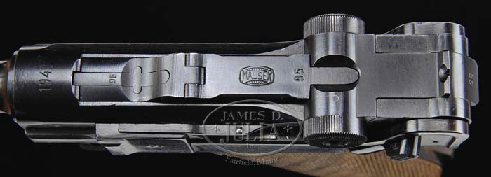 *EXCEPTIONAL MAUSER BANNER 1941 POLICE EAGLE L LUGER & HOLSTER RIG. SN 495y. Cal. 9 mm. Extraordinary Mauser banner Luger with 4″ bbl, Mauser banner on front toggle link & “1941” chamber date. It has Eagle “L” proof on right side of receiver with sear safety & is mounted with full checkered walnut grips that are unnumbered. It is accompanied by two matching numbered magazines in an “A. FISCHER / BERLIN C.2 / 1942” marked orig, untouched black leather holster. The #2 magazine is a “HAENEL SCHMEISSER PATENT” & the other a standard magazine. A nicer, all orig, as issued, WWII German Police Luger rig would be extremely difficult to find. PROVENANCE: Doug Smith Collection. CONDITION: Extraordinarily fine, all matching, except grips which are unnumbered but orig to this pistol. Overall retains 98%+ orig factory blue with blue loss at the stock lug where it appears to have been stored with a stock attached & with slight muzzle edge wear. Grips are extremely fine with one or two chipped diamonds showing extremely light wear with attractive wood grain showing through. Magazines are very fine showing light wear with a small dent in the #2 magazine. Crisp mechanics, brilliant shiny bore. Holster is near mint & untouched. 4-36138 JR190 & BS (6,000-9,000)