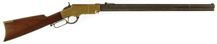 MARTIALLY MARKED HENRY MODEL 1860 LEVER ACTION RIFLE. Cal. 44 RF Henry. SN 3321. Standard martial Henry with 24-1/4” oct bbl with integral magazine tube, German silver front sight and 900 yard Henry ladder rear sight. Right side of bbl has the “C.G.C” and “H” inspector marks with the “HH” inspector marks on the receiver. Mounted with a nicely figured, field replacement buttstock. Left side of lower tang & inside toe of buttplate also have serial number. The number was not observed in top tang channel of buttstock. Inside toe of buttplate has a curious brazed area, apparently to fill a small gap when the stock was replaced. Henry rifles in this serial number series were primarily issued to the 3rd Veterans Volunteers organized toward the end of the Civil War and primarily used in the defense of Washington. At the expiration of term of service the volunteer was allowed to retain his Henry rifle, revolver & equipment as an incentive for the reenlistment. There are some records of the Henry rifles that were issued, available through the Springfield Research Service, a private organization. CONDITION: Very good. No orig finish remains, being a cleaned, silver/gray patina with some fine pitting on the bbl. Lever & hammer also have the same patina. Receiver was cleaned & polished a long time ago with some light hammer marks on left sideplate and a few light dings elsewhere. Stock is sound & clean with minor nicks & scratches, fits very well and retains most of its varnish finish. Mechanics are fine, strong bore with light to moderate pitting. 4-30596 (27,500-37,500)