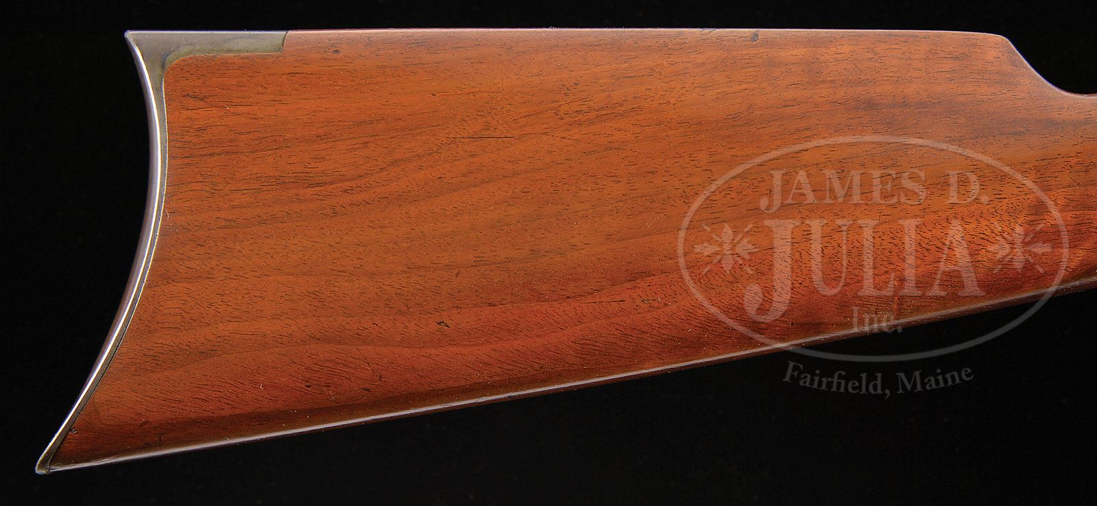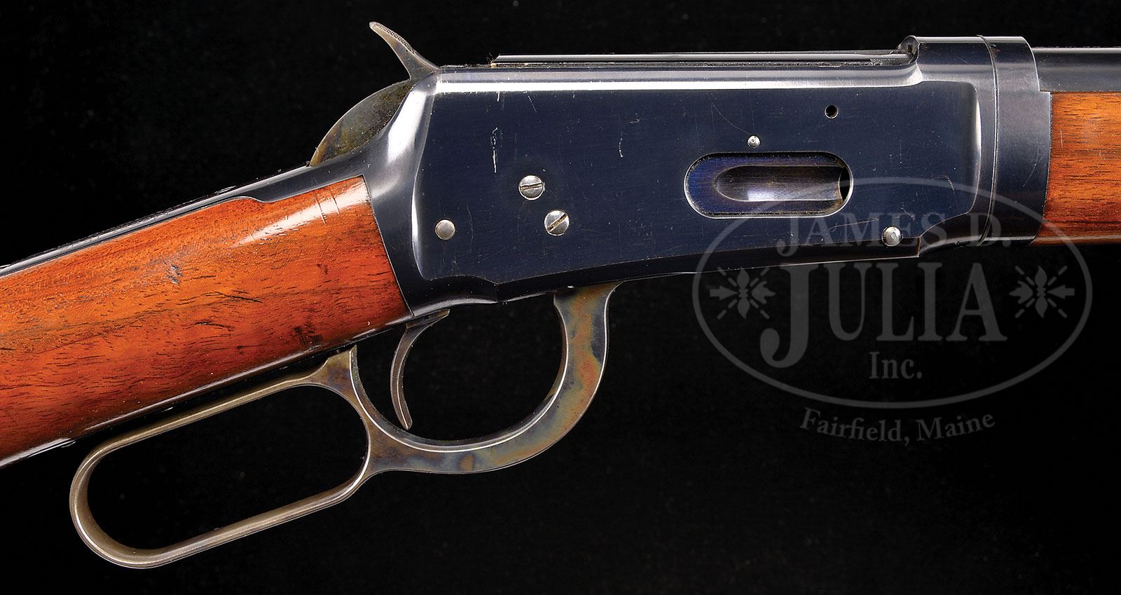 RARE SPECIAL ORDER WINCHESTER MODEL 1894 TAKEDOWN LEVER ACTION RIFLE. SN 147289. Cal. 25-35. Scarce rifle in rare caliber, standard grade with 26″ tapered rnd bbl, full magazine, takedown with tall gold bead Lyman front sight & semi-buckhorn rear sight. Mounted with nicely figured, tiger-striped, straight grain American walnut, with straight stock and crescent buttplate. ’94 rifles in this cal. are rarely found today with any orig finish or a decent shootable bore. Because the cal. was suitable for game up to deer sized animals and therefore the rifles were considered ladies or boys guns and usually reflect that level of attention. PROVENANCE: Woody Frey Collection. CONDITION: Extremely fine plus, all orig. Overall retains about 99% crisp orig blue on the bbl, magazine tube, forend cap, takedown ring and receiver with receiver showing a few very fine scratches and faint sharp edge wear. Loading gate retains virtually all of its bright fire blue. Lever and hammer retain virtually all of their brilliant case colors, lightly faded on outer faces of lever. Buttplate retains traces of case colors mostly faded to medium patina. Forearm has a hairline at the rear edge, otherwise wood is sound with a few minor nicks & scratches and retains about all of its bright, orig factory varnish, lightly dulled on the forearm at the carry point. Mechanics are crisp, bright shiny bore. Has been fired, but very little. 4-48438 JR208 (5,000-8,000)