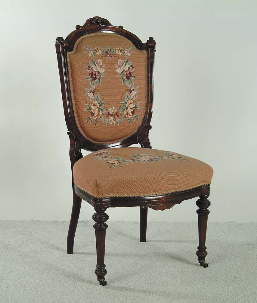 VICTORIAN SIDE CHAIR WITH NEEDLEWORK UPHOLSTERY. Upholstered back and seat with roses. Carved walnut with turned legs on castor feet. SIZE: 39” h x 17-1/2” seat h. CONDITION: Some minor repair, very good. 9-96255 (75-125)