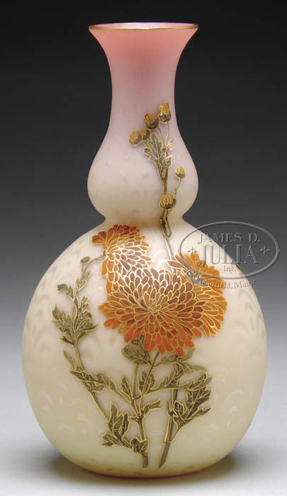 WEBB BURMESE SATIN GLASS VASE. Webb Burmese MOP satin glass vase in the peacock eye pattern with an enamel decoration of gold mums, leaves and branches as well as having five bumble bees on the reverse side. Unsigned. SIZE: 8-3/4″ t. CONDITION: Very good to excellent. 5-61239 (8,000-12,000)