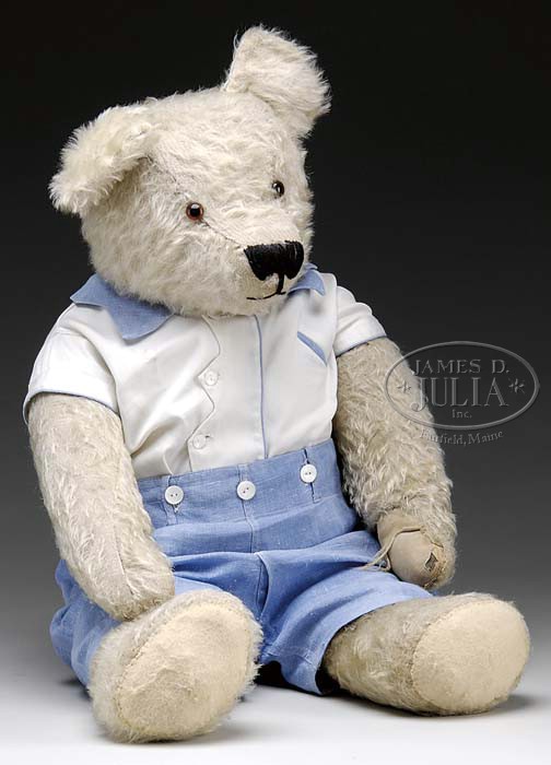 WHITE MOHAIR TEDDY BEAR. Extremely large mohair teddy bear, probably from the 1920s? Bear is stuffed with straw, has felt pads on feet and probably replaced cloth pads on paws, amber glass eyes, head, arms and legs swivel as well as a black stitched cotton thread nose and mouth. Although not a Steiff bear, it has a very pleasing and warm appearance. Bear is dressed in a blue and white linen short set. SIZE: 31″ t. CONDITION: Bear must have been well loved, it shows some mohair loss on body and face. There is some re-stitching under the chin. 1-11426 (600-900)