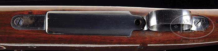 *EXTRAORDINARILY RARE SPRINGFIELD MODEL 1903 BOLT ACTION MILITARY RIFLE WITH 8-GROOVE BORE AND WINCHESTER A5 SCOPE. SN 716929. Cal. 30-06. Usual configuration with 24″ bbl marked “SA / 6-17” with a flaming bomb in the center. It has standard front sight, rear sight and split front band/bayonet lug with stacking swivel and a grooved rear band with sling loop and a corresponding sling loop in the buttstock. It has high, grooved, 1-pc handguard with two spring clips. Bbl and front receiver ring are mounted with scope blocks containing a Winchester A5 scope with sgl post reticle. Receiver has usual markings with milled trigger guard & floorplate and checkered buttplate with trap containing a nickeled brass oiler/cleaning kit. Rifle is mounted in extraordinarily beautiful, uncheckered, tiger-striped American walnut with straight grip. The bore has very rare experimental rapid twist 8-groove rifling which apparently did not progress beyond the experimental stage. This exact rifle is identified by SN and pictured on p. 504 of the book The Springfield 1903 Rifles, Brophy,and the muzzle of the bbl is pictured on p. 557 of the same book. This rifle is ultimately unique with its 8-groove rifled bore and arsenal mount of the Winchester scope. Undoubtedly Springfield was experimenting with accuracy testing possibly for a new sniper rifle. This gun has 8 lands/grooves, not 7 as stated in Brophy’s book on pages 504 & 557, but the image clearly shows 8 grooves. PROVENANCE: Bob Rosenthal Collection. CONDITION: Very fine to extremely fine. Bbl & bands retain about all of their orig arsenal finish with bright bbl blue. Receiver & bolt retain about 90% strong orig arsenal finish with trigger guard & floorplate retaining most of their bright orig arsenal blue. Wood is sound with a few chips in finish and light handling & storage marks and retains most of its bright varnish finish. Mechanics are crisp, bright shiny bore. Scope retains most of its orig factory blue with only some minor rust on top adjustment knob. Optics are fine. 4-39210 (16,000-20,000)