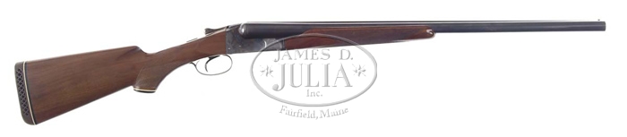 *LEFEVER A GRADE DBL BBL SHOTGUN. Cal. 12 ga. SN 302212. Boxlock Lefever made by Ithaca with 25-3/8″ bbls choked MOD-CYL/MOD-CYL with concave matted rib, dbl ivory beads, bbl extension 2nd bite with ejectors & sgl non-selective trigger. It is mounted with straight grain American walnut with checkered beavertail forearm with push-button release & pistol grip stock, 13-3/4″ over a modified white line pad. Stock is probably an old replacement with an extra long wrist & short comb. Accompanied by a modern green pebble grain leather green ultra-suede lined trunk case. CONDITION: Fine. Bbls retain 96-98% of a fine professionally restored finish. Receiver retains 75-80% orig case colors, brilliant on the sides, top tang & trigger plate, faded & thin on the bottom. Trigger guard has a restored finish. It appears that the bbls have been trimmed to their present length. Wood is sound and retains most of its professional finish. Case is new. 4-57430 JR679 (500-800)