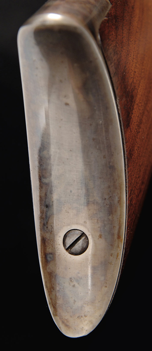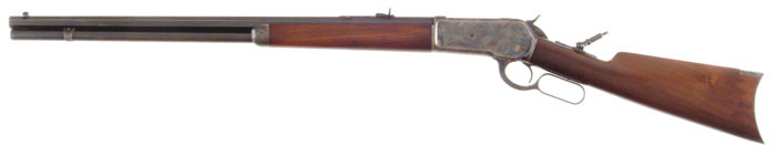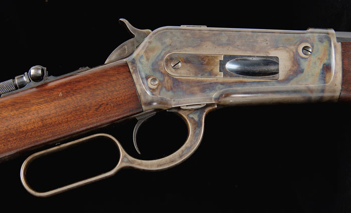 WINCHESTER MODEL 1886 LEVER ACTION RIFLE. Cal. 45-90. SN 99610. Standard grade rifle with 26″ oct bbl, full magazine, ivory bead front sight, semi-buckhorn rear sight & Lyman tang sight with loop. Mounted with nicely figured uncheckered American walnut with straight stock & crescent buttplate. CONDITION: Extremely fine, all original. Bbl retains 93-95% strong bright orig blue with edge & muzzle wear. Magazine tube retains most of its orig finish turned plum, slightly thin on bottom. Forend cap, receiver, lever, hammer and buttplate retain virtually all of their orig case colors, strong in most areas, brilliant in sheltered areas. Wood is sound with minor handling & storage marks with some dulling to forearm. Mechanics are crisp, brilliant shiny bore. 4-59508 (15,000-20,000)