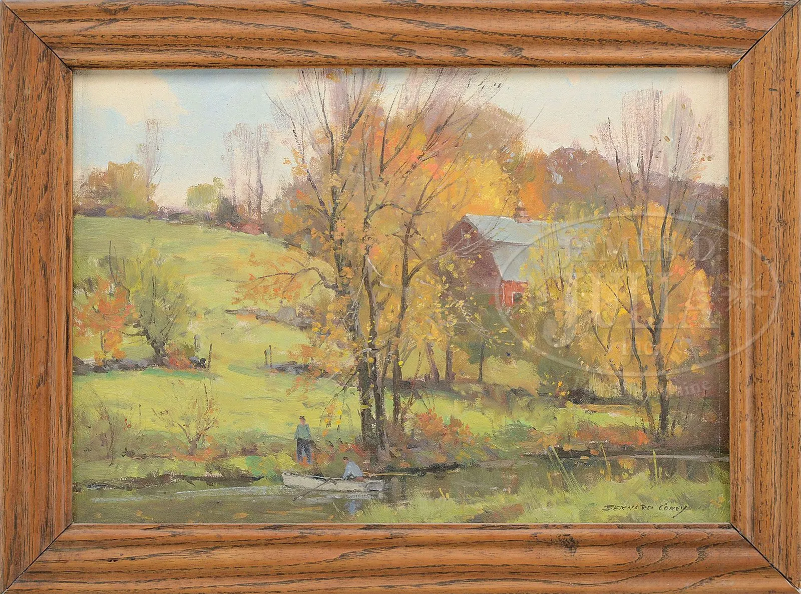 BERNARD COREY (American, 1914-2000) “FALL ON THE FARM”/ FISHERMAN RETURNING WITH DAY’S CATCH. Oil on artist’s board Housed in a carved natural oak frame, early 20th century with some losses Signed “Bernard Corey”, lower right Identified on verso SIZE: 10″ x 14″. Overall: 12-1/2″ x 16-3/4″ PROVENANCE: The John F. Gale Collection, Cambridge, MA CONDITION: Scattered retouch to center of composition, otherwise good 9-27345 (1,300-1,900)
