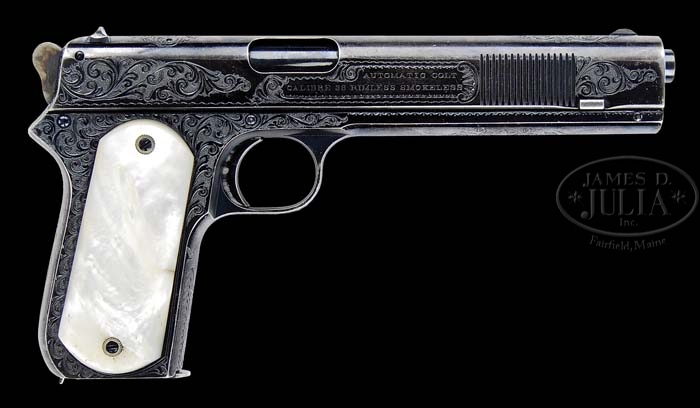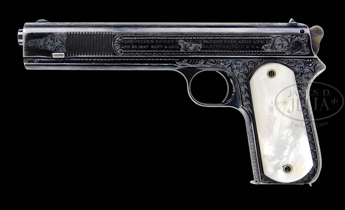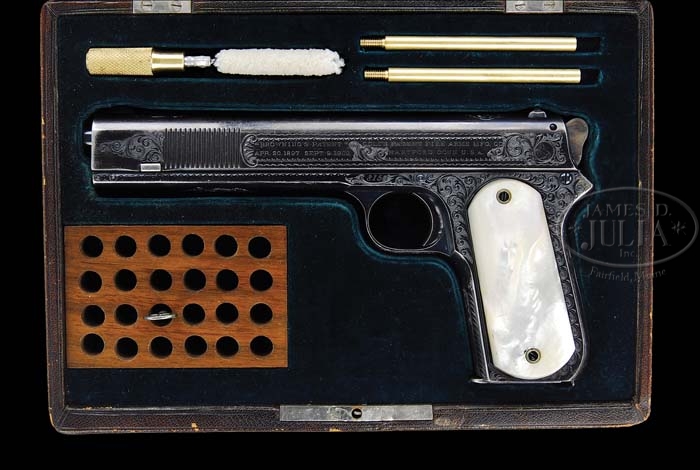 *EXTRAORDINARILY RARE AND THE ONLY KNOWN CASED FACTORY ENGRAVED COLT MODEL 1902 SPORTING SEMI-AUTO PISTOL. SN 8150. Cal. 38 ACP. Blue finish with 6″ all blue bbl, orig fixed sights with usual Browning’s Patent & Colt Patent markings on left side of slide and usual markings on right side of slide. It has a hand checkered rnd spur hammer and is mounted with orig, thick, smooth pearl grips and is accompanied by an orig all blue magazine with patent marked floorplate. Pistol is engraved in the readily identifiable style of Cuno Helfricht, with flowing foliate arabesque patterns on each side of frame that wrap around the grips and extend over the trigger guard. Both front sides of the frame have chip & dot borders that extend all the way to the muzzle end. Front strap is engraved with matching foliate arabesque patterns and has feather patterns on each side. Backstrap has matching engraving with a blank presentation banner in the center. Bottom front of frame has a matching foliate arabesque pattern with an 8-pointed flower blossom in the center. Trigger bow is also engraved to match. Sides of slide have matching foliate arabesque patterns with a wavy outside border and a chip & dot inside border terminating with a shell pattern at each forward end. Top of slide has two matching intertwined foliate arabesque patterns. Rear of slide and top rear edge of frame are engraved in feather patterns. All of the foliate arabesque patterns have a very fine punch dot background. This pistol has been examined by several noted Colt authorities and all concur with this cataloger’s assessment that this pistol is factory orig in every respect and was engraved by Cuno Helfricht himself. These letters accompany. Also accompanied by an orig, period, Colt-style casing covered in brown leather with border embossed lid and a nickeled lock & escutcheon mortised into the front. Interior is lined in dark green velvet, French fitted in bottom for the pistol with three small open slots in rear which now contain a brass cleaning rod and bore mop that consignor had especially made for this set. Left front of the case has a walnut cartridge block for 24 cartridges. This case is nearly identical to one which appears on the cover of A Collector’s Guide to Colt 38 Automatics, Sheldon, which houses the only other known cased 1902, which is a military model, SN 14765. This case has minor differences in the interior layout. There is only one other factory engraved Sporting Model 1902, #4302, which is listed as factory engraved and of this writing is not known. The pistol presented here is a “no record” entry signifying that it was a special production, probably as a presentation by a company executive. The book A Collector’s Guide to Colt 38 Automatics, Sheldon, on p. 130 states that the “Factory year end inventory dated December 31, 1904 lists two leather cases for the military model still in stock.” He goes on to say that shipping ledgers do not list these cases as ever having been sent out with orders, so it is likely only a handful were ever made for presentation purposes when the pistol was first introduced. Page 84 of this same book states that “Perhaps three dozen pistols were shipped with special order pearl or wood grips, the former being more popular.” And on p. 76 he states that shipping records indicate that only one pistol (sporting model), #4304, was factory engraved and that it was fitted with pearl stocks. As of this writing that pistol remains undiscovered. This pistol and its display won the Judge’s Choice Award at the Annual Colt Collectors Association Meeting in 2007 and is pictured on p. 24 of the Winter 2007 Rampant Colt magazine with the owner at that time. That award accompanies this pistol. There are several instances where it is stated by the various authors that Sporting Model 1902, SN 4304, is the only factory engraved specimen and that about five were inscribed. Those publications include The Colt Engraving Book Volume I, Wilson; Colt Pistols, Wilson & Habel and The Book of Colt Firearms, Sutherland & Wilson. Consignor states and has certified in a signed letter, that this pistol was received for services by a doctor in the 1920’s or 30’s and remained in that family in the Rocky Mountain West until 2002 when it was purchased directly from that doctor’s family. The individual who purchased it traded it to the consignor, making him only the fourth owner since it was produced in 1905, 104 years ago. CONDITION: Very fine. Overall retains 93-94% strong, glossy orig factory blue with slight thinning in a few areas and with wear around muzzle end of slide. Backstrap is slightly thinned. Hammer retains virtually all of its orig factory case colors. Grips are completely sound with one minor age line and retain great fire and color. Mechanics are crisp, bright shiny bore. Pistol may be unfired just handled & played with. Case is moderately scuffed with storage & handling marks and worn corners but is completely sound in all respects. Interior is strong & bright with only slight wear in bottom pistol recess from grip and muzzle end of slight. A truly exceptional and rare set. A once in a lifetime opportunity to own a stunning, one of a kind piece of history. 4-39045 JR224 (80,000-125,000)