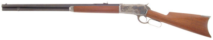 WINCHESTER MODEL 1886 LEVER ACTION RIFLE. Cal. 45-90. SN 42904. Standard grade rifle with 26″ oct bbl, full magazine, half nickel front sight & semi-buckhorn rear sight. Mounted with uncheckered, straight grain, nicely figured, American walnut with straight stock & crescent buttplate. Accompanied by a Cody Firearms Museum letter fully identifying this rifle and indicating receipt in warehouse May 13, 1890 with shipment on Sept. 22, 1890. CONDITION: Very fine. Bbl retains 95-96% strong orig blue with sharp edge wear & some thinning about mid-point. Magazine tube retains 70-80% strong orig blue with balance turned plum. Receiver retains 75-80% strong case colors on both sides & on receiver ring with bottom & top edges turned silver. Lever retains 75-80% case colors faded on outer edges, strong & bright in sheltered areas. Hammer retains 75-80% faded case colors & buttplate traces of colors, mostly gone to silver. Wood is sound with a few minor nicks & a series of small bruises on forearm. Forearm retains all of a light wiped on finish & buttstock about all of its orig factory finish with a small spot of touchup on right side. Mechanics are crisp, bright shiny bore with some orange peel roughness. 4-58876 JR163 (9,000-12,000)