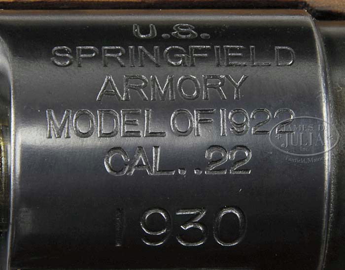 *EXTREMELY RARE SPRINGFIELD MODEL 1924 INTERNATIONAL SMALL BORE MATCH RIFLE. SN 1930. Cal. 22. Incredibly rare with only 12 of these rifles produced at Springfield Armory in 1924 for the American International Rifle Team. This rifle is fitted with a 30″ extra heavy tapered rnd bbl of the same contour as its big brother, the 30 caliber International Match rifle. Front sight is identical to the 30 caliber making use of an unaltered BAR front sight with the addition of a Winchester-style Globe front sight. Top of bbl is drilled & tapped for target scope bases with the center hole over the chamber area having the remains of a broken drill still in place. Bottom of bbl is hand stamped with a matching SN. Receiver is marked with the standard Springfield Armory M1922 roll marking and SN. Rear bridge of receiver is mounted with a Lyman 48C receiver sight with target knobs. The bolt is 1922 style that has been altered to a sgl striker firing pin with a short throw “speed lock”. Trigger guard is a standard 1903 milled equipment fitted with Waller dbl set triggers and a 1st variation steel palm rest bracket mounted in the magazine well, containing a Type 1 USMC cork ball palm rest. Left side of the magazine well is electric pencil marked with the SN “1257699”. The rifle to which that SN was assigned and which apparently had this trigger guard was originally a 30 caliber rifle fitted with a Remington 30″ bbl and which finished number one in accuracy out of 40 rifles tested for the 1924 International Rifle Team. This information is contained in a lengthy article which appeared in The American Rifleman, February 1924. Mounted in a 1924 International match stock with very nice straight grain having a wide squared forestock with deep, heavy checkered, pistol grip wrist, straight fluted comb and fitted with a Model 1924 International Match adjustable aluminum buttplate. Bottom of forestock is inletted for and contains a Swiss style adjustable front sling swivel. This exact rifle is pictured in great detail on pp. 119 & 121 of The Springfield 1903 Rifles, Brophy, and is identified by SN on p. 121, which SN is also visible in one photograph. This is an extremely rare Springfield rifle, considered by many to be one of the most rare of all. PROVENANCE: Brophy Collection; Peter Cardone; Bob Rosenthal Collection. CONDITION: Extremely fine. Bbl & receiver retain 95-97% strong orig arsenal blue with only light edge wear and some minor wear from the stock under the forestock. Bolt body is bright with the shroud & striker retaining generous amounts of orig blue. Stock is sound with only light handling & storage mars and retains a fine light, probably orig oil finish. Mechanics are crisp, brilliant shiny bore. 4-42367 JR105 (12,500-17,500)