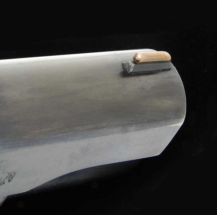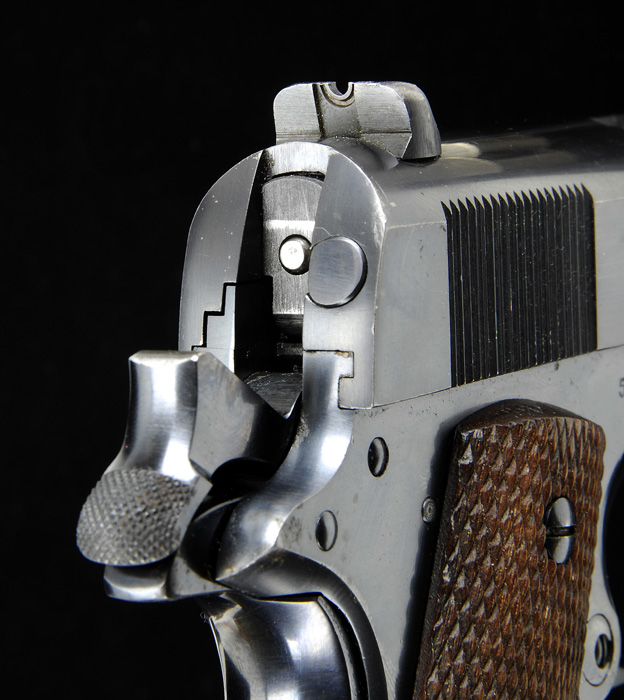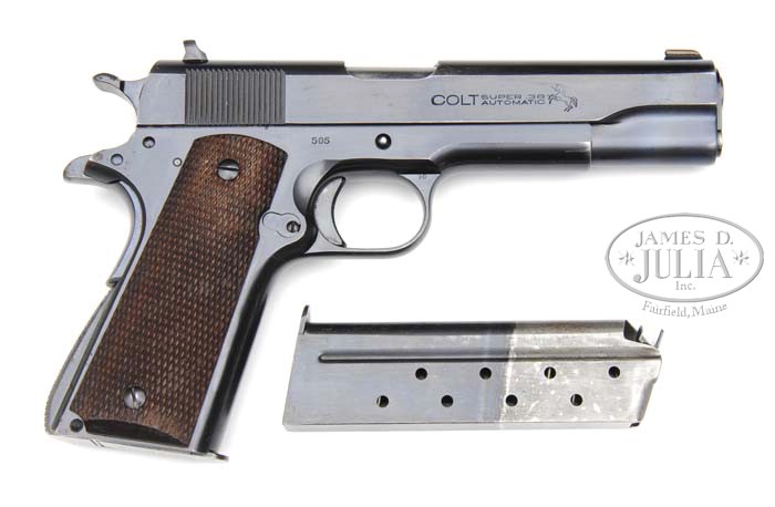 Additional Information: At the time the front site was replaced the top end of the slide (near the site) was freshened with cold blue. *SCARCE PRE-WWII COLT SUPER 38 GOVERNMENT MODEL SEMI-AUTO PISTOL. SN 505. Cal. 38 Super. First year production, blue finish with 5″ bbl and mounted with full checkered walnut grips. Bottom edge of left grip is hand scratched “G.D. POPE”. Left side of slide has usual company name & address and patent dates and right side is marked “COLT SUPER .38 / AUTOMATIC” and has the rampant Colt. Slide is matching numbered to the frame. Sights are period of use replacements by King with a brass bead Sheard front sight and an adjustable rear sight. Accompanied by two orig 2-tone 38 Super magazines with marked bases. Altogether a fine pistol that can be used as is or restored to orig configuration with the addition of orig sights. CONDITION: Extremely fine. Shows only light muzzle edge wear on the slide and very faint sharp edge wear elsewhere with crisp front strap and grip safety. Bbl & bolt face show very little wear. Grips have a few mashed diamonds and show light diamond point wear. Mechanics are crisp, brilliant shiny bore. Both magazines retain virtually all of their strong orig finish with some minor discoloration on the “white” areas. 4-42044 JR188 (2,000-3,000)