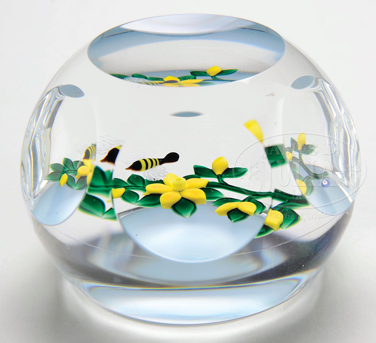 BOB BANFORD FLORAL PAPERWEIGHT. A yellow and black bumblebee hovers over a branch with yellow blossoms and buds. Design rests on a powder blue ground. Six side facets, one top facet and is signed with a “B” signature cane. SIZE: 3″ dia x 2″ t. CONDITION: Very good to excellent. 5-65390 (200-400)