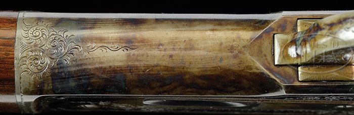 EARLY SPECIAL ORDER ENGRAVED WINCHESTER MODEL 1886 LEVER ACTION RIFLE. SN 6928. Cal. 45-90. Wonderful deluxe ’86 with 26″ rnd bbl, button magazine, Rocky Mountain front sight and altered semi-buckhorn rear sight that has a platinum line below the very fine notch. Receiver is engraved by John Ulrich, signed on bottom tang, in style #10 with a #7 bull moose vignette on left side. Right side is engraved in a panel above loading gate “E.B.M. FROM A.W.H.” Sides of lever & hammer, forend cap, top & bottom tangs and bolt are engraved to match. Engraving extends over chamber area of bbl and around front sight. Chamber end of bbl & muzzle have silver band inlays. Receiver & forend cap are color case hardened. Mounted with spectacular, streaky, burl walnut with H-style checkered forearm and straight stock with Winchester hard rubber buttplate. Buttplate is cracked & broken with chipped toe. Left side of lower tang is marked with assembly number “E1600”, “XXXX” and “RB”. Matching assembly number is also found in top tang channel of buttstock. Accompanied by a Cody Firearms Museum letter which identifies this rifle in caliber 45-90, rnd bbl, bbl engraved & inlaid, plain trigger, checkered walnut stock – engraved, Rocky Mountain front sight, platinum sporting rear sight, half magazine, shotgun butt, rifle buttplate, dull oil finish, “receiver, etc. engraved $7.50”, inside finish, received in warehouse Aug. 4, 1887 and shipped two days later. Note: Inside the receiver & moving parts are bright polished. PROVENANCE: Wes Adams Estate Collection. CONDITION: Extremely fine, all matching. Bbl retains 98-99% strong orig factory blue; receiver & forend cap retain about all of their brilliant factory case colors, lightly faded on top and bottom of receiver; lever & hammer retain brilliant case colors, moderately faded on trigger loop and turned silver on outer face of finger loop. Stock has a hairline at the toe, adjacent to the chipped buttplate, otherwise wood is sound with a few very minor nicks & scratches and retains virtually all of its wonderful factory oil finish. This is a nearly new rifle and may be unfired. Mechanics are crisp, brilliant shiny bore. 4-44443 JR41 (50,000-80,000)