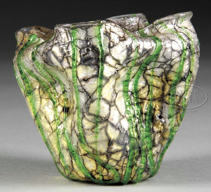 STEVENS & WILLIAMS SILVERIA VASE. Square shaped vase with pinched in sides and all over decoration of silver and black with applied green threading. This vase is pictured in the book Spinning Wheels Collectible Glass Edited by Albert Christian Revi on page 65. The photo is listed as a small experimental Silveria vase by John Northwood II. “Trailings of green and yellow on a transparent crystal-silver ground. Authors Collection.” Our consignor tells us he bought this vase directly from Mr. Revi. SIZE: 3″ w x 2-3/4″ t. CONDITION: Internal stress lines on body of vase from the making. 5-61914 (500-1,000)