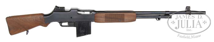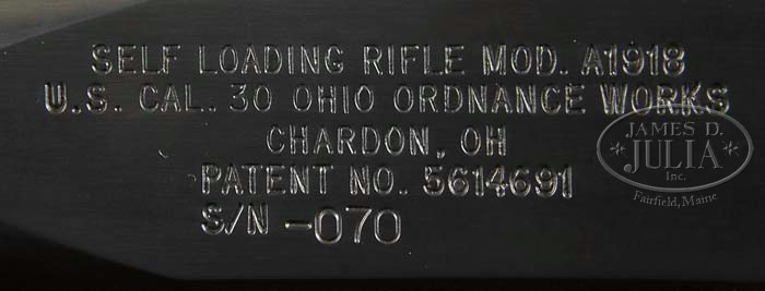 *BROWNING SELF-LOADING RIFLE MODEL A1918 BY OHIO ORDINANCE WORKS. SN 070. Cal. 30-06. Semi-automatic version of the Browning automatic rifle with third variation of gas port adjustment nut. Bbl is 27″ including flash hider and marked “8 18” with flaming bomb proofs. Receiver has fine commercial grade blue finish, two position safety and mag release in trigger well. Mounted with a standard 1600 yd adjustable rear sight and hooded post front sight. Oil finished walnut buttstock with steel buttplate and sling swivel. Matching coarse checkered wooden forend. Firing mechanism operates smoothly when cycled by hand. Three magazine are included which snap smartly into magazine well. Weight:16.7 lbs. PROVENANCE: Dr. Leonard Goldfarb Collection. This gun bearing SN 070 was made especially for Dr. Goldfarb and given to him on his 70th birthday by Val Forgett of Navy Arms. CONDITION: As new retaining all of its original blue and wood finish. Bolt and bolt face appear unfired. Buttstock and forend are fresh and unmarked. Bore is bright and shiny. Top quality parts on a new manufactured receiver makes this a shooters dream. 4-46050 JWD100 (3,000-5,000)