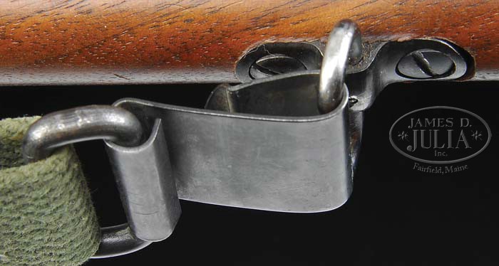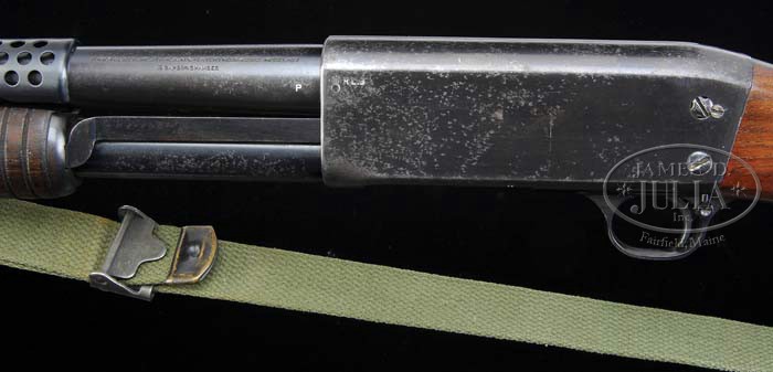 *THE RAREST OF ALL TRENCH GUN MODELS, THE ITHACA MODEL 37. SN 60974. Cal. 12 ga. 20″ bbl with 6-row heat shield with bayonet lug. Left side of bbl at chamber marked “ITHACA GUN CO. INC. ITHACA, N.Y.-PATENT NO. 1849982 MODEL-37/12 GA.-2-3/4″ CHAMBER”. Lower left side adjacent receiver is a “P” aligned with “ORDINANCE BOMB” & “R.L.B.” on receiver for inspector “Roy L. Bowlin”. Front right side of receiver is stamped with SN, as well as matching number on bottom of bbl. No other markings are found. Mounted with straight grain walnut, pistol grip, hard rubber serrated buttplate, inlet base with swivel 3″ from toe, carrying an OD green canvas sling. Stock is un-numbered factory replacement, 16-ring corn cob forend. The total production of WWII Model 37 trench guns is reported to be 1,422, and fall in the SN range of 57820 to 61450. CONDITION: Very good. Heat shield retains most of its orig blue and is missing the bead sight. Exposed bbl shows thinning orig blue with some very fine flaked spots of surface oxidation. Receiver and mag tube show orig blue with considerable flaked finish from shallow surface oxidation mostly in forward portion and bottom of receiver. The factory replacement stock is sound with some normal nicks & dings, and retains orig oil finish. Forend is sound with normal nicks, dings & some tiny chips and retains an oil finish with hand worn patina. Mechanics are crisp with a shiny bore with a couple shallow scattered pits. 4-39177 BDT159 (10,000-12,500)