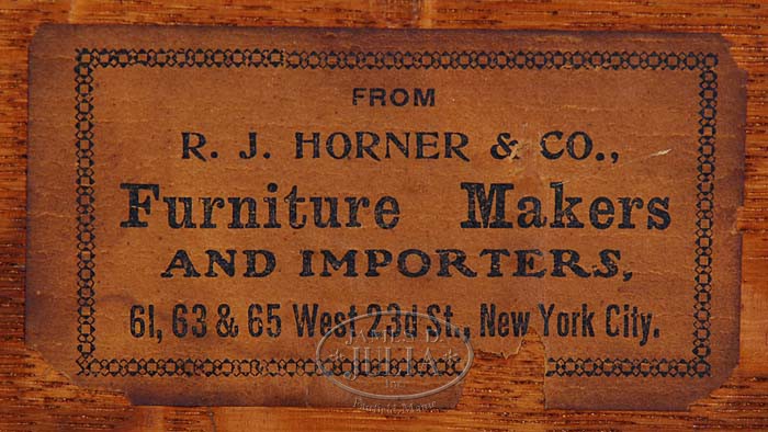 HORNER LIBRARY TABLE. Last quarter 19th century. This labeled example with rectangular top and incise-carved edge above the conforming bombe frieze fitted with a pair of aligned short drawers and opposing sham drawers, all carved with scrolling leaftips, centering scrolled scallop shell handles. The trestle base formed by carved lions decorated with ‘S’ scrolled leaftips joined to a flattened leaf-carved medial stretcher, the whole raised on claw feet. SIZE: 29-1/2″ h. x 54″ l. x 34″ d. PROVENANCE: From an extensive private Gulf Coast collection. CONDITION: Professionally refinished with medium brown mahogany color. Very fine overall, with no restoration noted. One small chip to a leaftip. Label affixed to one drawer bottom. 9-93480 (5,000-8,000)