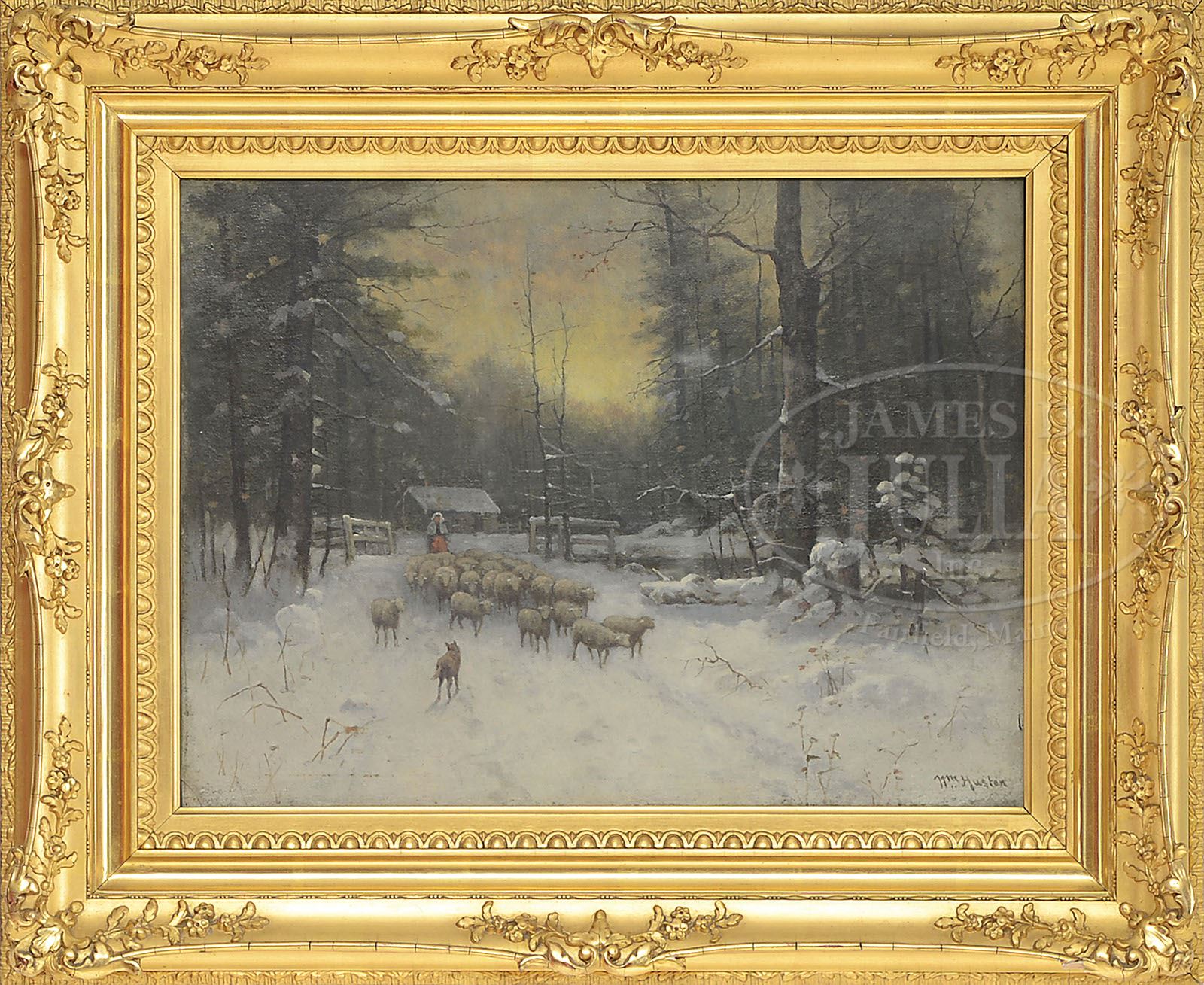 WILLIAM HUSTON (American, 19th Century) “WINTER”. Oil on canvas Housed in what appears to be its original gilt fancy frame with gilt liner behind glass Signed bottom right “Wm Huston”, retaining its original Salmagundi Club auction sale exhibition attached to verso SIZE: 12″ x 16″. Overall: 18-1/4 x 22-1/4″. PROVENANCE: From a fine Augusta, Maine home. CONDITION: Very good. 9-29236 (1,000-1,500)