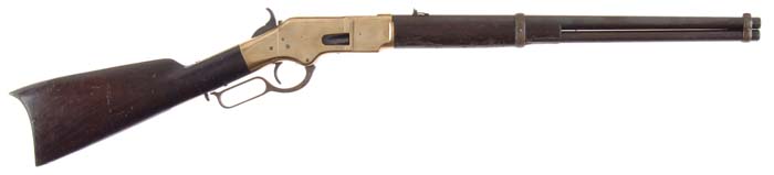 WINCHESTER MODEL 1866 SADDLE RING CARBINE. Cal. 44 CF. SN 101243. Standard carbine with 20” rnd bbl, full magazine with integral front sight and 2-position flip rear sight. It has a staple & ring in left side of receiver. Mounted with what may be a replacement buttstock with an unusual semi-crescent iron buttplate. It has standard forearm. CONDITION: Poor to fair. No markings remain on bbl with iron being a dark brown, attic patina with scattered pitting. Receiver & carrier have several dents & dings and have been polished bright. Forearm is missing a large section of the tip and has a couple of cracks with heavy battering, buttstock is also somewhat battered, and both have a very dark finish. Screws are battered. Mechanics are fine, worn dark bore with heavy pitting. 4-30115 JR240 (1,000-1,500)