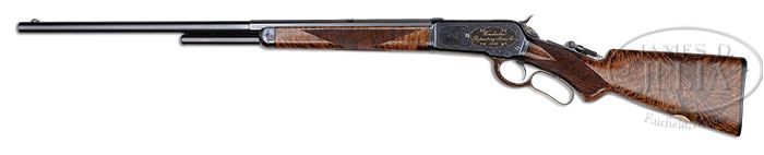 EXTREMELY RARE ENGRAVED & GOLD INLAID WINCHESTER MODEL 1886 LEVER ACTION FACTORY EXHIBIT RIFLE. SN 99580. Cal. 45-70. Spectacular ’86 with 26″ oct to rnd bbl, 2/3 magazine, ivory bead hunting front sight, slot blank in rear seat & Lyman tang sight. Receiver is factory engraved probably by John Ulrich, in a modified #10 style with a large panel on left side inlaid in gold script “Winchester / Repeating Arms Co. / 1895.” all surrounded by gold wire inlay. Right side has the vignette of a bugling bull elk. Mounted with 3-4X, extremely beautiful flame & shell grain American walnut with H-style checkered forearm and serpentine grip with black insert and Winchester hard rubber buttplate. Left side of lower tang is marked with assembly number “467”, a defaced assembly number “1140”, “XXS”. The “467” assembly number and the defaced assembly number are both found in top tang channel of buttstock. Bottom of buttstock has an inlaid gold initial oval inscribed with the intertwined “WRACO” initials. Accompanied by a Cody Firearms Museum letter which identifies this rifle in caliber 45-70, half oct bbl, plain trigger, checkered stock with pistol grip, Lyman combination front sight and flat top sporting rear sight, 2/3 magazine, shotgun butt with rubber buttplate, inlaid in gold, $5.00 engraving, blue frame and “WINCHESTER R.A. CO. 1895”, received in warehouse May 23, 1895 and shipped same day to Order #11542, repair & return Jan. 6, 1899. It seems likely that when this rifle was returned in 1899 it was refinished and the new assembly numbers stamped on tang & buttstock. Very likely the sights were changed at the same time. This rifle is pictured on p. 227 of The Book of Winchester Engraving, Wilson, and on p. 240 of Winchester Engraving, Wilson, with credit to the Ivan B. Hart Collection. Mr. Wilson notes that “It is likely the rifle was used as a sample or show gun.” PROVENANCE: Wes Adams Estate Collection; Ivan B. Hart Collection CONDITION: Extremely fine. Overall retains virtually all of its fine, bright factory restored finish to both metal & wood showing no evidence of use since restoration. Mechanics are crisp, bright shiny bore. 4-44442 JR42 (35,000-50,000)