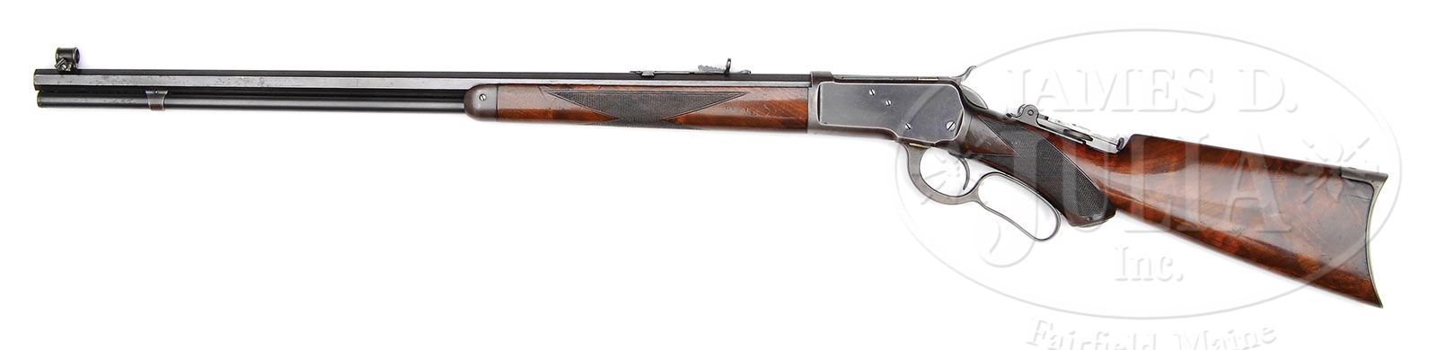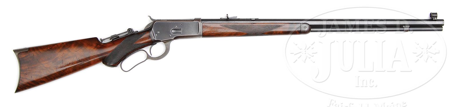 *FINE DELUXE WINCHESTER MODEL 1892 LEVER ACTION RIFLE. SN 369344. Cal. 25-20. Beautiful special order rifle with 24-1/4″ oct bbl, full magazine, windgage globe front sight, semi-buckhorn rear sight and a thin base mid-range vernier tang sight. Mounted with about 2X shell & flame grain, center crotch American walnut with H-style checkered forearm and capped pistol grip stock with crescent buttplate. Left side of lower tang, under the wood, is marked with assembly number “2679” and “X”. Matching assembly number is also found on rear face of buttstock, under buttplate, and inside toe of buttplate. Accompanied by a Cody Firearms Museum letter which identifies this rifle, as found, with “WIND GAUGE FRONT SIGHT – WITHOUT LEVEL” and mid-range vernier peep sight, received in warehouse Nov. 18, 1909 and shipped same day, order number not listed. PROVENANCE: Wes Adams Estate Collection. CONDITION: Very fine. Bbl retains about 95% strong orig blue with some scattered fine pin prick pitting toward the muzzle and light sharp edge wear; magazine tube retains 97-98% strong orig blue; receiver retains about 80% thinning orig blue, mostly gray patina on the belly; lever & hammer retain case colors in sheltered areas, mostly faded to silver; buttplate is a silver metal patina. Stock has a hairline back of the top tang, otherwise wood is sound with light handling & use nicks & scratches with some light crazing and overall retains about all of its orig piano varnish finish. Mechanics are crisp, strong bore, dark in the grooves. 4-44621 JR49 (8,000-12,000)