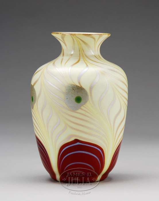 STEUBEN RED PEACOCK FEATHER VASE. Extremely rare Steuben peacock feather vase has red aurene pulled feather design surrounding the foot giving way to a lovely creamy yellow feather extending to the neck. The feather eyes are done in gold iridescence with rich green centers. The inside of the mouth is finished with a lovely gold iridescence. Signed on the bottom “Aurene 539”. SIZE: 7″ h. CONDITION: Very good to excellent. 5-67603 (30,000-40,000)