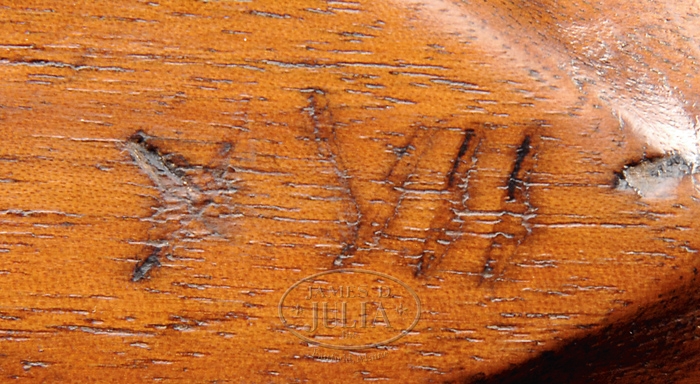 CONFEDERATE ALTERATION OF VIRGINIA MANUFACTORY ARTILLERY MUSKETOON. SN NSN. Cal. 69. Mr. Michel describes this gun as follows: “Bolster alteration to percussion of Virginia Manufactory artillery musketoon. Lockplate of musket marked forward of hammer ‘Virginia Manufactory’ and at tail ‘Richmond 1818’. All components marked with orig assembly number ‘6’. Alteration by Thomas J. Adams in Richmond with three faceted bolster and re-assembly Roman numeral groups on inner face of new percussion hammer, inner face of lockplate, underside of bbl, and left side of stock opposite lockplate”. VA Manufactory artillery musketoons are scarce enough in flint, much less with a Confederate alteration to percussion. This particular gun is illustrated and described on pp. 31-32 of Murphy & Madaus’ Confederate Rifles and Muskets. This gun is orig and complete, and it would be hard to find another specimen. CONDITION: Metal surfaces cleaned, gray and pitted. Assembly number “6” appears on bands, sideplate, trigger guard. This number is not discernible on exterior of buttplate; however, buttplate is certainly orig to this gun with matching metal surfaces to rest of gun. Stock is good and sound, with scattered scratches, nicks, and dings. Stock has old repair on wood opposite lock. 4-31275 JS206 (3,000-5,000)