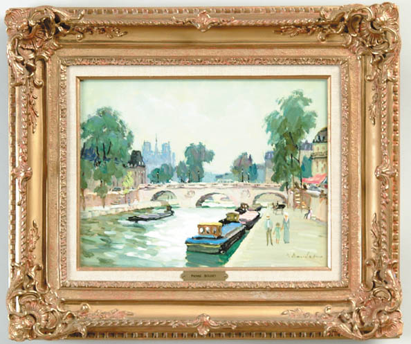 PIERRE BOUDET (French, 1925-) PARIS – QUAI DES ORFEVRES. Oil on masonite Paris scene shows river with river boats, three-arch bridge, people walking along side, green trees, horse and carriages and cars. Colorful café awning on right side with Notre Dame in the background. Signed lower right “P. Boudet”. Housed in a fine pierce gesso decorated gilt frame. Back has title, size and artist’s name, No. 101. SIZE: 11” x 13-3/4”. CONDITION: Very good to excellent. 9-94396 (2,000-3,000)