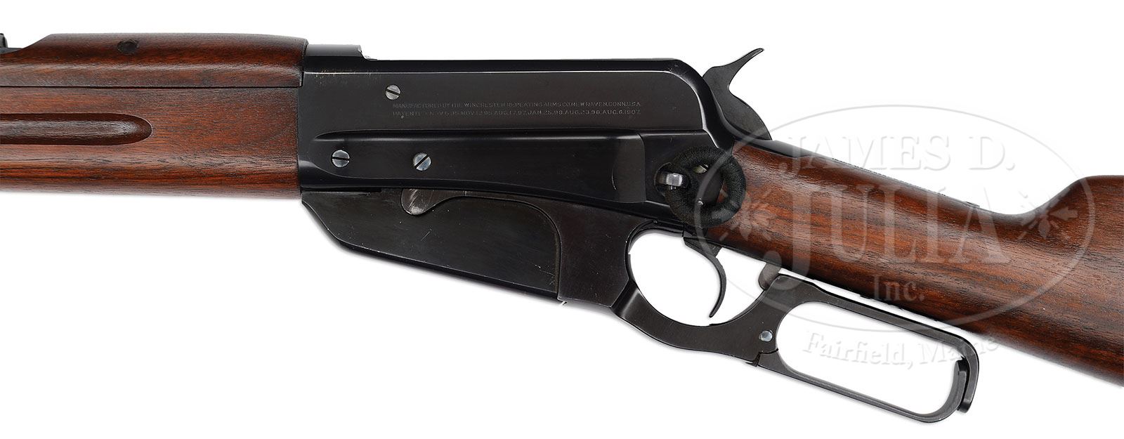 *SCARCE WINCHESTER MODEL 1895 SADDLE RING CARBINE. SN 402406. Cal. 30 Army. (30-40 Krag). Standard grade carbine with 22″ tapered rnd bbl, pedestal mounted front sight and 1800 yd carbine/musket rear sight. Left side of receiver has a stud & ring. Ring is covered in cloth. Mounted with very nicely figured, uncheckered, American walnut with grasping groove forearm, upper hand guard, secured with a single band and straight stock with carbine/musket buttplate with trap, containing a brass pull through with brush and jag. The Winchester ’95 carbine is a popular, quick pointing saddle gun that was very popular, especially in the American west and Northwest territories. They are also very popular with hunters in the American deep woods across the country and especially in Canada. The cartridge was very popular and proved to be an accurate and very effective big game round. Numerous other ’95 carbines were sold to and used by security guards at various installations, dams and mines around the U.S. They usually show hard use. PROVENANCE: Woody Frey Collection. CONDITION: Extraordinarily fine, crisp, new and unfired. 4-48433 JR186 (10,000-15,000)