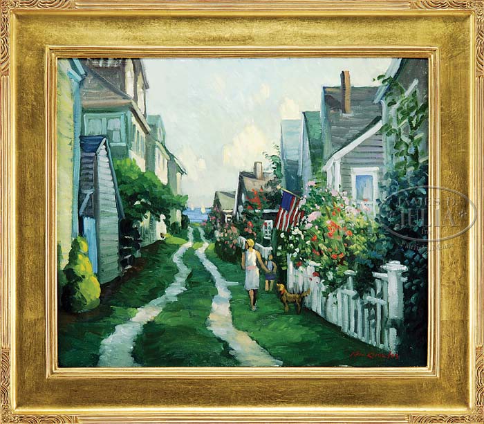 KEN KNOWLES (American, 1968-) “SCONCETT SUMMER, NANTUCKET, MA”. Oil on canvas scene shows a pathway to the sea lined with houses. A woman and child with dog stand next to a picket fence with flowers and American flag. Signed lower right. Titled and signed on reverse and dated “2009”. Housed in a modern carved and gilt wood frame. SIZE: 20″ x 24″. CONDITION: Very good to excellent. 9-98590 (2,000-3,000)