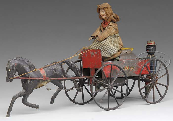EXCEEDINGLY RARE IVES HOOK BEHIND CLOCKWORK TOY. One of the most desirable of Ives early horse drawn vehicles that is fresh to the market, from the original owner. The toy depicts a woman dressed provincial clothing driving a one horse country wagon with four large cast iron wheels as black mask face boy dressed in blue jacket, red pants, and tin hat trails behind. When wound, his articulated cast iron legs simulate running as the woman rocks to and fro and the horse gallops all simultaneously. Polychrome wagon features traces of original fruit decals, and partial label stating patent date under the woman’s seat. This outstanding toy would enhance any advanced collection or stand on its own. SIZE: 17″ l. CONDITION: Toy appears to be all original with paint loss to carriage and horse. Seat appears to have old resoldering. Figures’ clothing shows some staining and discoloration, and front shafts supporting horse need to be resoldered, but overall for a toy of this age in very good condition. 1-11114 (12,000-15,000) Auction: Advertising, Toy & Doll - Fall 2011 Please Note: All prices include the hammer price plus the buyer’s premium, which is paid by the buyer as part of the purchase price. The prices noted here after the auction are considered unofficial and do not become official until after the 46th day. |