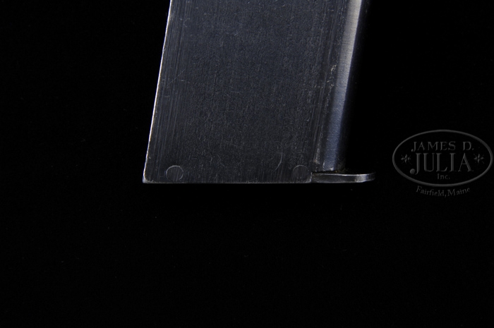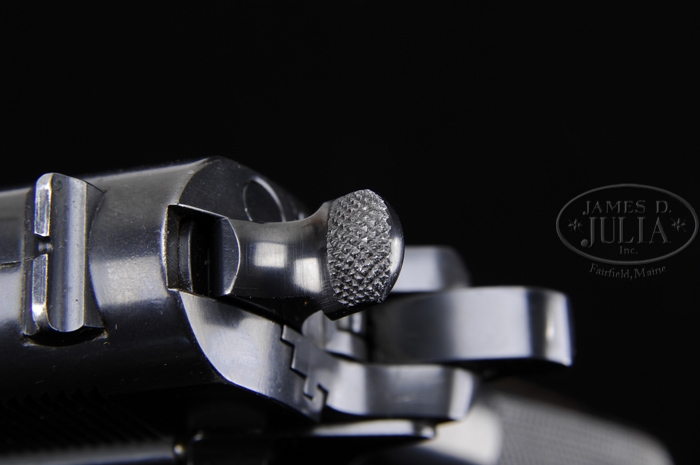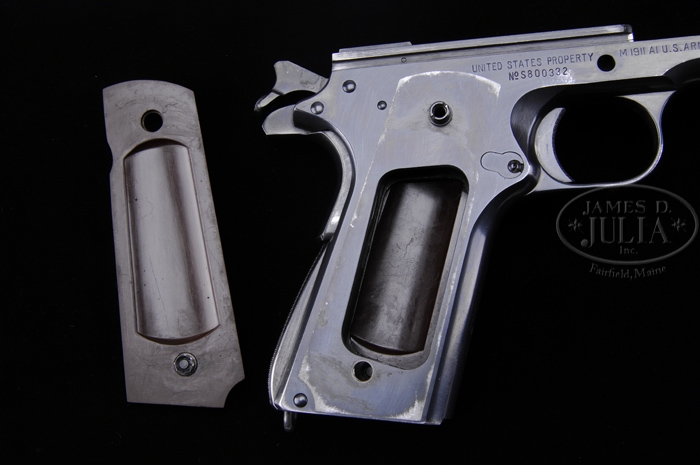 CORRECTION: “JKC” inspectors initials are not for Col. John K. Christmas, but are for John K Clement. *EXTREMELY RARE SINGER MODEL 1911A1 SEMI-AUTO MILITARY PISTOL. SN S800332. Cal. 45 ACP. Blue finish with 5″ bbl that has a “P” proof on top left rear side of bbl lug. Slide is marked on left side “S. MFG. CO. / ELIZABETH, N.J., U.S.A.”. Top of slide, forward of rear sight has a “P” proof with the leg pointing forward. Left side of frame has an identical “P” proof just above the magazine release and the “JKC” (Lt. Col. John K. Christmas) inspector initials behind and above the trigger opening. Right side of the frame, slightly above and to the right of the grip, is marked “UNITED STATES PROPERTY M 1911 A1 U.S. ARMY” with the SN below. Pistol has an arched mainspring housing with fine checkered back strap, a long spur grip safety and short wide hammer spur. Mounted with orig unaltered Singer brown plastic grips without donuts around the screw holes and no reinforcing on the inside. Accompanied by one orig Singer magazine and two Colt commercial magazines. Also accompanied by a WWII era brown flap holster with “US” embossed on the flap and two 20-rd boxes of WWII 45 ACP ammunition with head stamps “RA 41”. Additionally accompanied by a small tin box containing a pair of military issue metal frame yellow lens goggles and a small tin of three Trojan prophylactics. This is believed to be one of the finest Singer pistols to come to market in recent years. This pistol and accessories is consigned from a Northeast family who inherited it from their Father, a WWII veteran. CONDITION: Very fine to extremely fine. Overall retains 96-98% strong orig blue with slight muzzle end wear on the slide and a small series of nicks on top of the slide just forward of the ejection port. Temper line is readily visible. Frame also shows light front edge wear with a couple of thin spots on the front strap and a couple more on trigger bow, otherwise blue is dark & strong. Bbl retains 88-90% strong orig blue, thinning over the skirt & chamber area with some light wear toward the muzzle. Grips have a chipped diamond and a couple of small bruises on right side, otherwise show only light wear. Mechanics are crisp, bright shiny bore. Orig magazine has a couple of wear spots on the sides with some minor use wear around the top and overall retains about 95% strong orig blue. Two commercial magazines are very fine. Cartridge boxes are still sealed but show moderate wear with the visible ammunition crisp & clean. Metal box & goggles are extremely fine. Prophylactics are crystallized & fragile, tin is fine. 4-40968 JR277 (20,000-35,000)