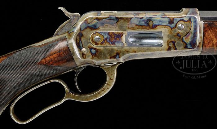 FINE DELUXE WINCHESTER MODEL 1886 LEVER ACTION RIFLE. SN 38649. Cal. 45-90. Beautiful deluxe ’86 with 26″ oct bbl, full magazine, half nickel front sight with screw and semi-buckhorn rear sight. Mounted with about 3X flame & shell grain American walnut with H-style checkered forearm and serpentine pistol grip stock with black insert and crescent buttplate. Left side of lower tang is marked with assembly number “255” and “X”. Top tang channel of buttstock is marked with matching assembly number. Buttplate, probably an old replacement, appears to have had the assembly number removed and currently is not marked. Accompanied by a Cody Firearms Museum letter which identifies this rifle, as found, received in warehouse May 2, 1890 and shipped same day to Order #11371. PROVENANCE: Wes Adams Estate Collection. CONDITION: Very fine to extremely fine. BBl & magazine tube retain about 98% strong orig factory blue with only faint sharp edge wear; forend cap retains about all of its faded orig case colors; receiver retains about 80% brilliant case colors turning silver on bottom; hammer retains very bright case colors, faded on top edge; lever retains brilliant case colors on left side, fading on right side and outer faces; buttplate is faded to silver. Wood is sound with a few light nicks & scratches and overall retains virtually all of its strong, orig piano varnish finish. Mechanics are crisp, very bright shiny bore. 4-44472 JR32 (30,000-50,000)