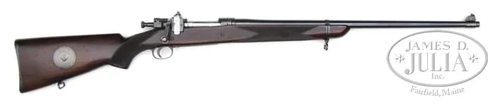 ADDITIONAL INFORMATION: The 1934 trophy rifle was won by Charles Blenman, Jr – Williams brother, who retired a Rear Admiral. Both the 1934 and 1936 trophy rifles exhibit fine jewelling on receiver rails. *RARE SPRINGFIELD MODEL 1903 SPORTER SECRETARY OF NAVY TROPHY RIFLE FROM 1936. SN 1417337. Cal. 30-06. Beautiful Sporter trophy rifle with 24″ tapered rnd bbl marked “SA / flaming bomb / 9-35” and has a sleeved M1903 front sight. Muzzle is stamped with the star gauge mark and bottom of bbl is stamped with the star gauge number “G/76” with a small “P” proof below. Receiver ring has standard M1903 markings and the rear bridge is mounted with a Lyman 48 receiver sight. Bolt body, extractor & handle are polished bright and the shroud, safety & striker are blued. It has standard milled M1903 trigger guard & floorplate and is mounted in a nicely figured M1922 Sporter half stock with nicely checkered forestock & pistol grip. Buttplate is Model 1922 checkered steel shotgun style. It has a standard M1903 sling swivel on bottom of butt and a grooved band around the forestock with sling swivel. Right side of butt is inlaid with a 2″ diameter round silver plate engraved “SECRETARY OF NAVY’S RIFLE TROPHY / WON BY MIDSHIPMAN / WILLIAM BLENMAN U.S.N. 1936”. The center of the plaque is engraved with a 3-masted sailing ship with anchor and spread-winged eagle in the foreground surrounded by “NAVY DEPARTMENT / UNITED STATES OF AMERICA”. Stock has two reinforcing crossbolts. On p. 213 of The Springfield 1903 Rifles, Brophy. Lt. Col. Brophy is discussing presentation rifles he states “These presentation models are the rarest of rare, as only five are known to have been awarded.” Consignor of two other trophy rifles being sold elsewhere in this auction states that of the five known awarded prize rifles two are in the Springfield Museum, he owns two of them, leading one to understand that this is probably the fifth rifle. This cataloger is of the opinion that there are actually more than five prize rifles known. Lt. Col. Brophy was probably speaking from personal knowledge at the time of the publication of his book. It is this cataloger’s contention that there are more than five of these rare rifles known today. Accompanied by a printout of A Citation for Gallantry, awarding the Silver Star to Commander, then Lt. Commander, for conspicuous gallantry and intrepidity 15 June to 4 July 1944 as Commanding Officer of the U.S.S. Shubrick, a destroyer protecting landing forces at Omaha Beach on D-Day and afterward. Blenman was a 1936 graduate of the U.S. Naval Academy and retired as a Rear Admiral. PROVENANCE: Rear Admiral William Blenman. CONDITION: Extremely fine. Overall retains 98-99% strong orig arsenal blue on the bbl & receiver with wear on the front sight sleeve, probably from a stamped sheet metal sight guard. Receiver has sharp edge wear. Receiver rails are polished bright and the outside rail is professionally jeweled, as is the follower. Trigger guard & floorplate retain just about all of their orig arsenal blue with some minor flaking, not wear, turned to dark patina. Stock is sound with a scratch on left side of butt and a couple of small dings and retains about all of its fine orig oil finish. Mechanics are crisp, brilliant shiny bore. 4-42456 JR114 (9,500-12,500)
