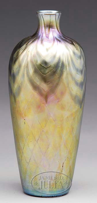 STEUBEN DECORATED VASE. Unusual gold Aurene vase has diamond quilted design around body with a subtle pulled feather design extending downward from the lip across the shoulders of the vase. Signed on the bottom “Aurene” and what appears to be “239b”. SIZE: 5-3/4″ h. CONDITION: Very good to excellent. 5-67529 (2,500-3,500)