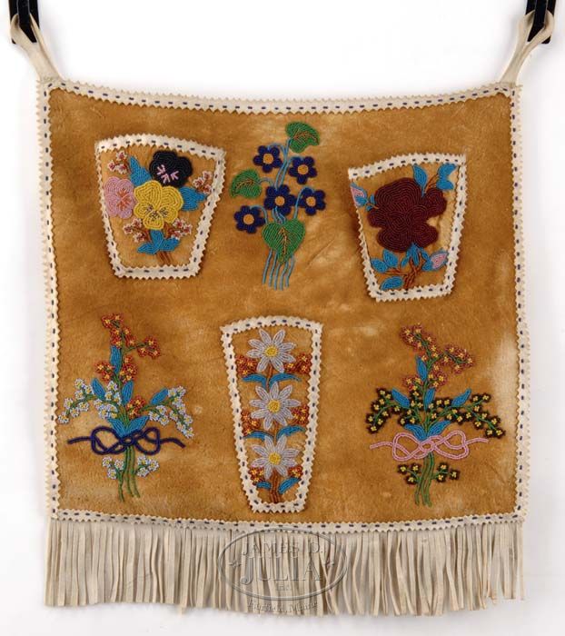 ALASKAN BEADED WALL HANGING WITH POCKETS, CIRCA 1915. With three beaded floral ribbon-tied sprays interspersed with three similarly beaded pockets, the bottom edge with fringe, with a scalloped, stitched, and beaded border. SIZE: 20” h overall x 17”w. CONDITION: Overall very good condition. 9-74457 MD (700-1,200)