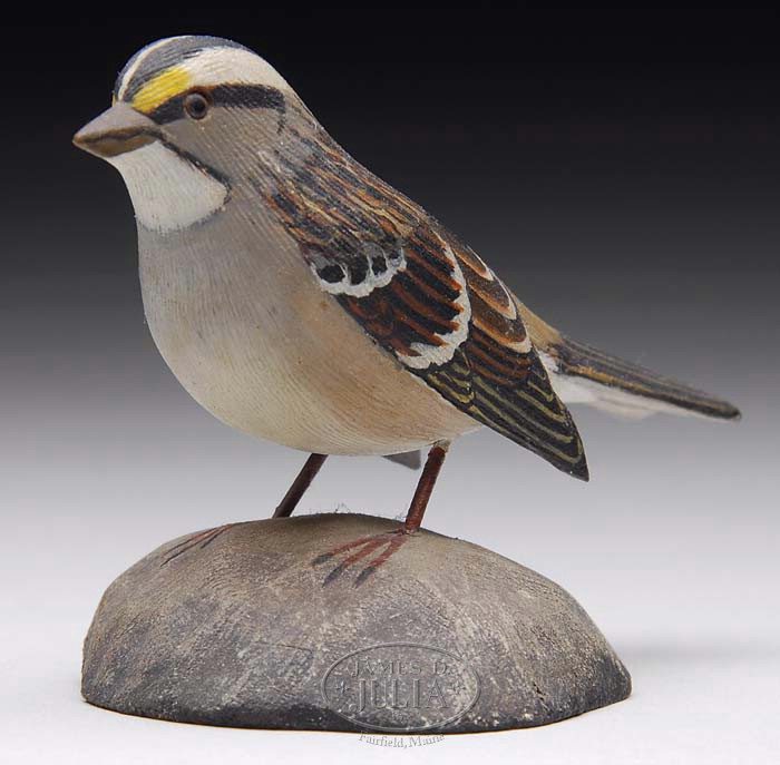 MINIATURE WHITE-THROATED SPARROW, ATTRIBUTED TO A. ELMER CROWELL. Nicely carved and painted on a rock plinth base, titled beneath “142 WHITE THROATED SPARROW” and artist’s logo. SIZE: 2-1/2″ h. CONDITION: Very fine original condition. 9-94911 (800-1,200)