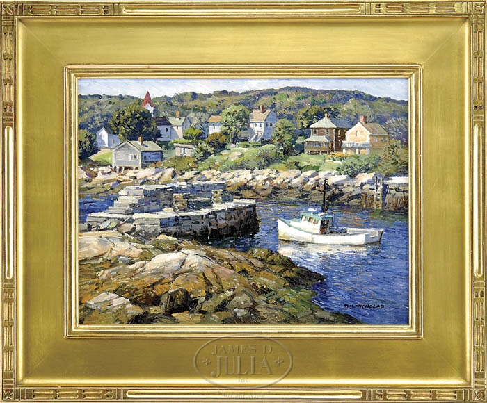 THOMAS M. NICHOLAS (American, 1963-) MAINE HARBOR. Oil on masonite Maine harbor scene shows a rock lined harbor with granite pier stacked with lobster traps. The shoreline dotted with colorful houses and red topped steeple. Signed lower right. Housed in a fine carved and gilt wood frame. SIZE: 12″ x 16″. CONDITION: Very good to excellent. 9-99437 (2,000-3,000)